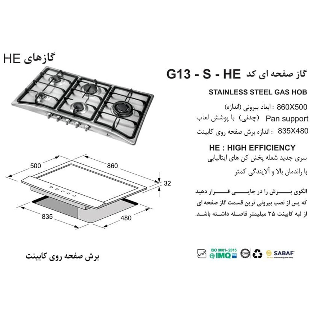گاز رومیزی اخوان مدل Gi13-S یک محصول متعارف و پرفروش از خانواده گیتا است که کیفیت ساخت قابل قبول قطعات ایرانی و راندمان انرژی مطلوب (رده A) را با قیمتی مناسب ترکیب می کند گاز Gi13-S گزینه ای محبوب برای خانواده هایی است که به دنبال گازی پنج شعله بادوام با هزینه اولیه معقول هستند. ویژگی اصلی گاز اخوان مدل Gi13-S صفحه تمام استیل آن از جنس AS304 است که مقاومت بالا در برابر زنگ زدگی خط و خش دارد و دوام محصول را تضمین می کند سطح صاف و صیقلی استیل نظافت را بسیار آسان می سازد این مدل با کسب رده مصرف انرژی A نشان می دهد که طراحی آن به گونه ای است که مصرف سوخت بهینه ای دارد و می تواند در بلندمدت منجر به صرفه جویی در هزینه های گاز شود ابعاد استاندارد ۸۶ در ۵۰ سانتیمتری آن برای نصب روی کابینت هایی با عرض حداقل ۸۵ سانتیمتر مناسب است.