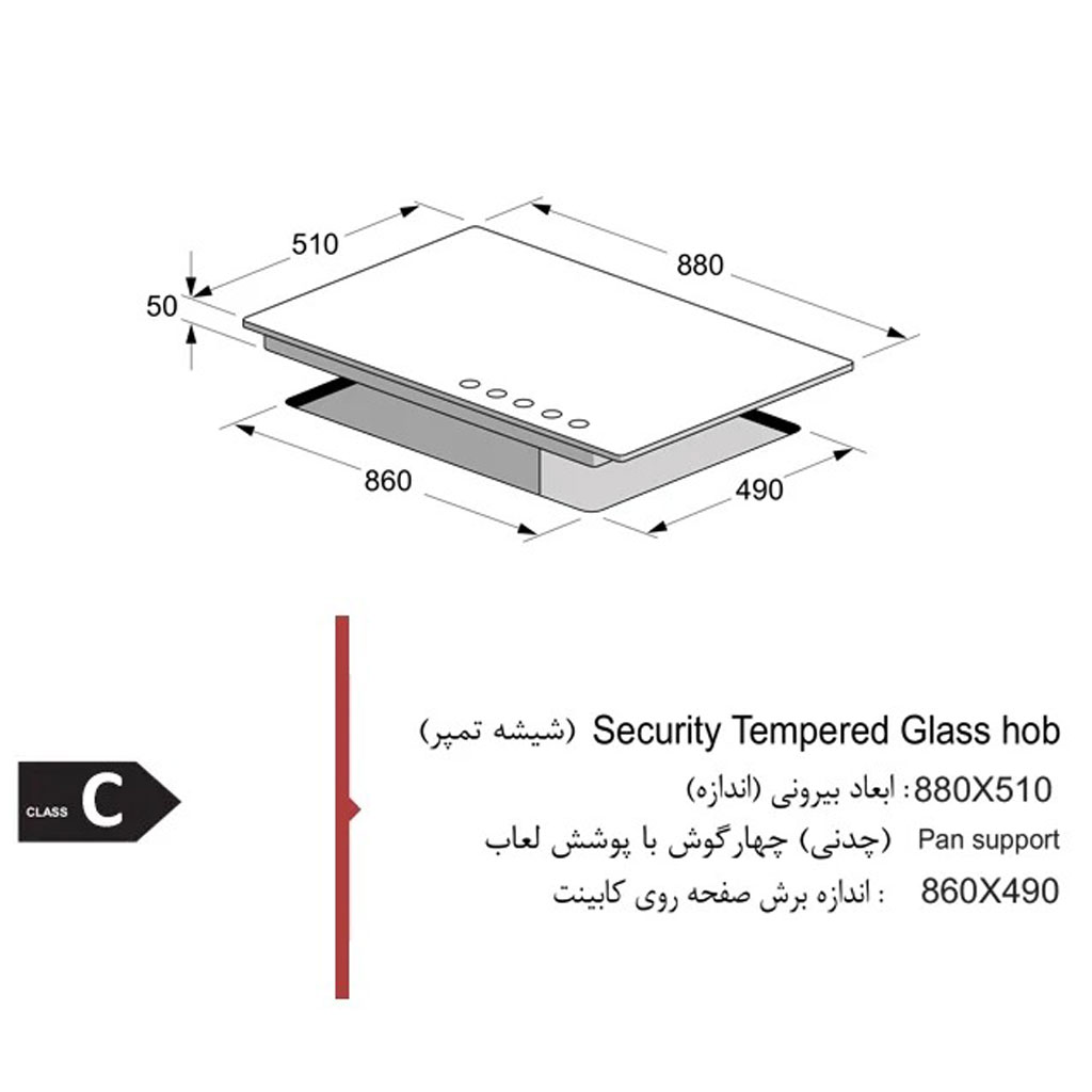 ابعد اجاق گاز: اندازه طول اجاق گاز: 88 سانتی متر, اندازه عرض اجاق گاز: 51 سانتی متر