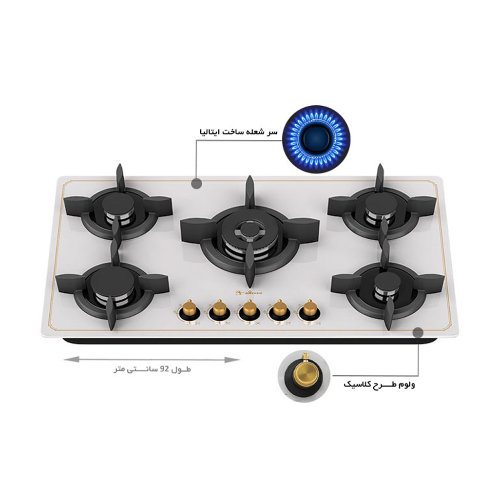 تعداد و آرایش شعله: پنج شعله (۱ عدد شعله پلوپز وسط، ۱ عدد شعله بزرگ، ۲ عدد شعله متوسط، ۱ عدد شعله کوچک)