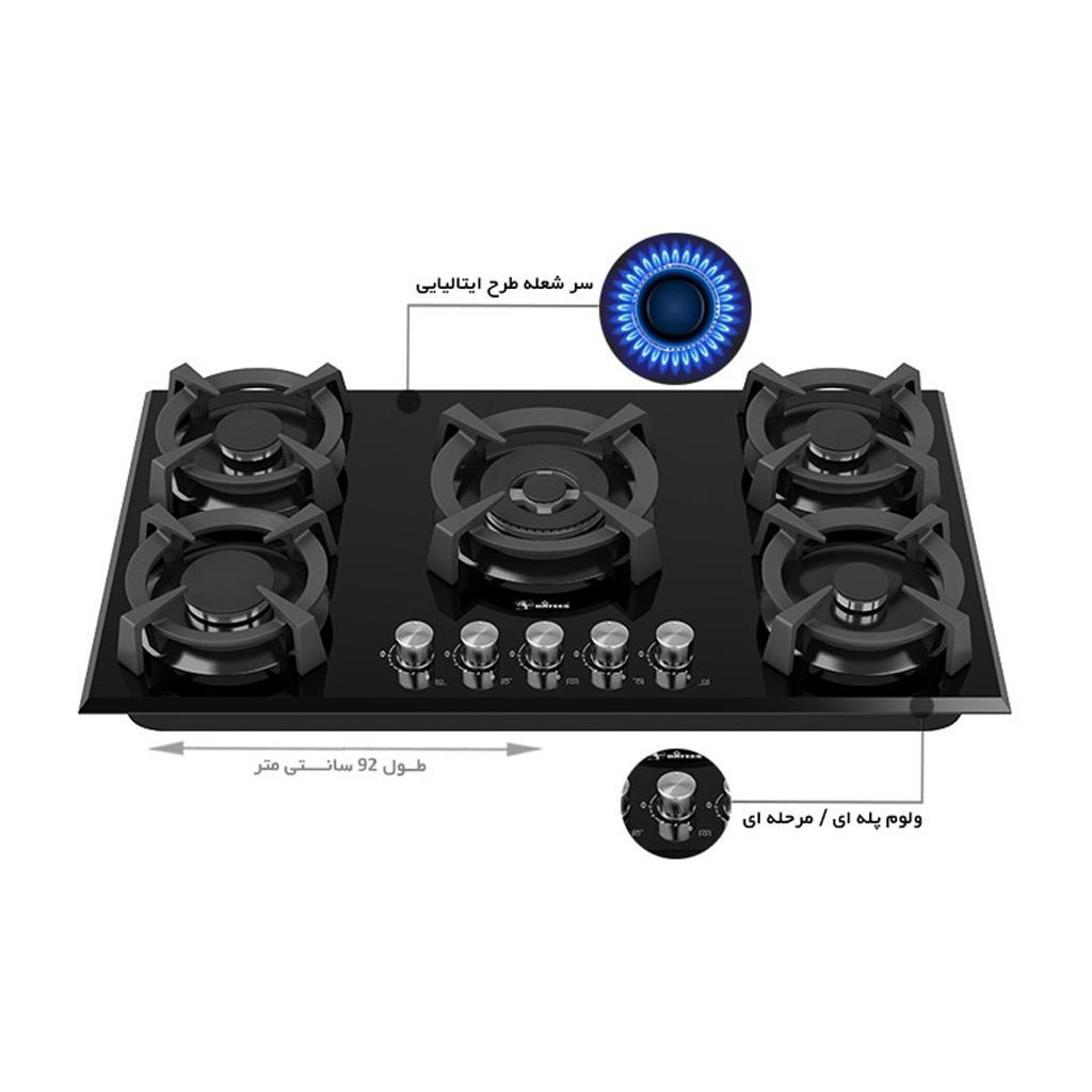 تعداد و آرایش شعله: پنج شعله (۱ پلوپز وسط، ۱ بزرگ، ۲ متوسط، ۱ کوچک)