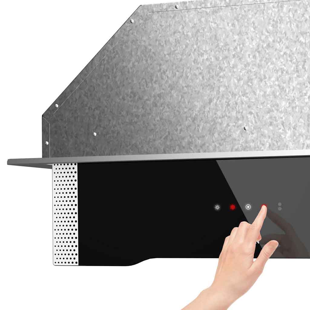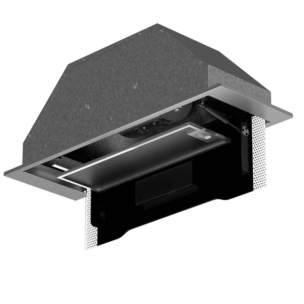 این هود با عرض ۹۰ سانتیمتر و نمای ترکیبی از شیشه سکوریت مشکی و فریم استیل، جلوهای لوکس و هماهنگ با انواع دکوراسیون آشپزخانه ایجاد میکند. شیشه مقاوم آن نه تنها در برابر حرارت و ضربه ایمن است، بلکه تمیز کردن آن را نیز بسیار آسان میسازد. ماهیت مخفی و نصب داخل کابینتی این هود، باعث میشود فضای باارزش آشپزخانه شما کاملاً حفظ شده و تنها در زمان نیاز، با آرامش و به لطف جک گازی نرم خود (Soft Open)، ظاهر شود.