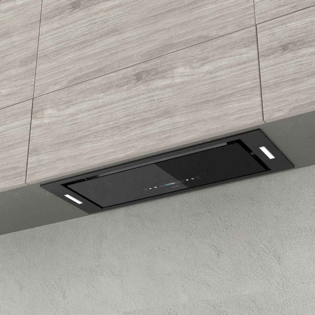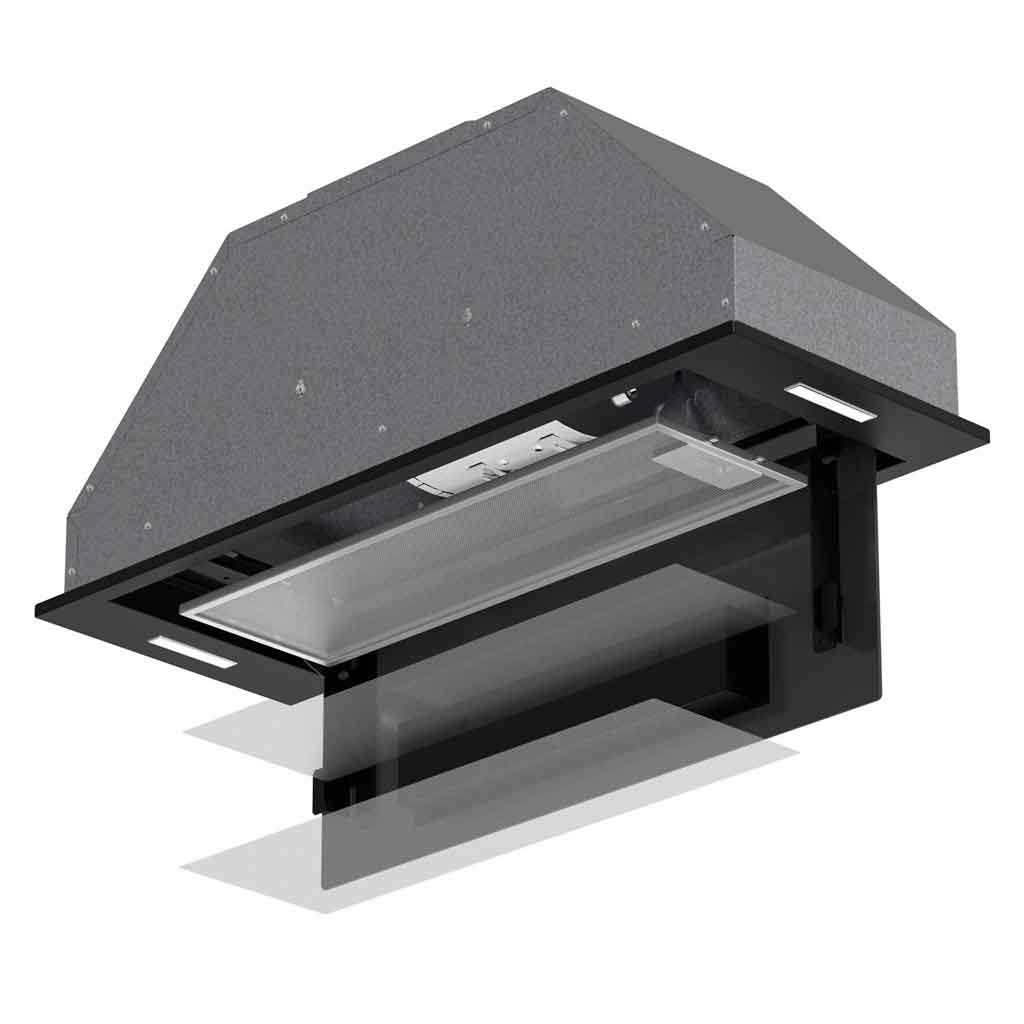 هود H808 با ابعاد ۸۰ سانتیمتری و طراحی مخفی خود، به راحتی در کابینتهای آشپزخانه جای میگیرد و زمانی که بسته است، تنها نمای شیشهای مشکی با فریم فلزی آن جلوهای از ظرافت و کلاس را به نمایش میگذارد. ویژگی برجسته درب جکی، باز و بسته شدنِ نرم و بیصدای درب را تضمین میکند و حس استفاده از یک محصول باکیفیت و لوکس را به کاربر القا میکند.