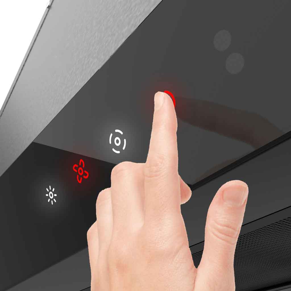 این مدل با بهرهگیری از سنسور فرمان با حرکت دست (موشن)، کنترل هود را به تجربهای مدرن و بهداشتی تبدیل میکند. شما برای تغییر تنظیمات، تنها نیاز به یک حرکت ظریف در مقابل سنسور دارید، بدون آنکه اثری از لمس بر روی سطح بینقص شیشه سکوریت مشکی آن باقی بماند. همچنین، صفحه کلید تمام لمسی امکان کنترل دقیق و آسان تمامی قابلیتها را در اختیار شما قرار میدهد.