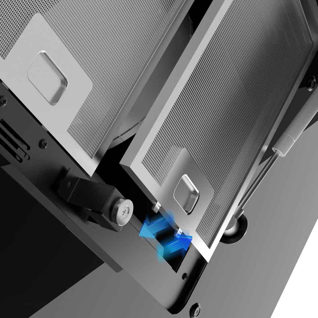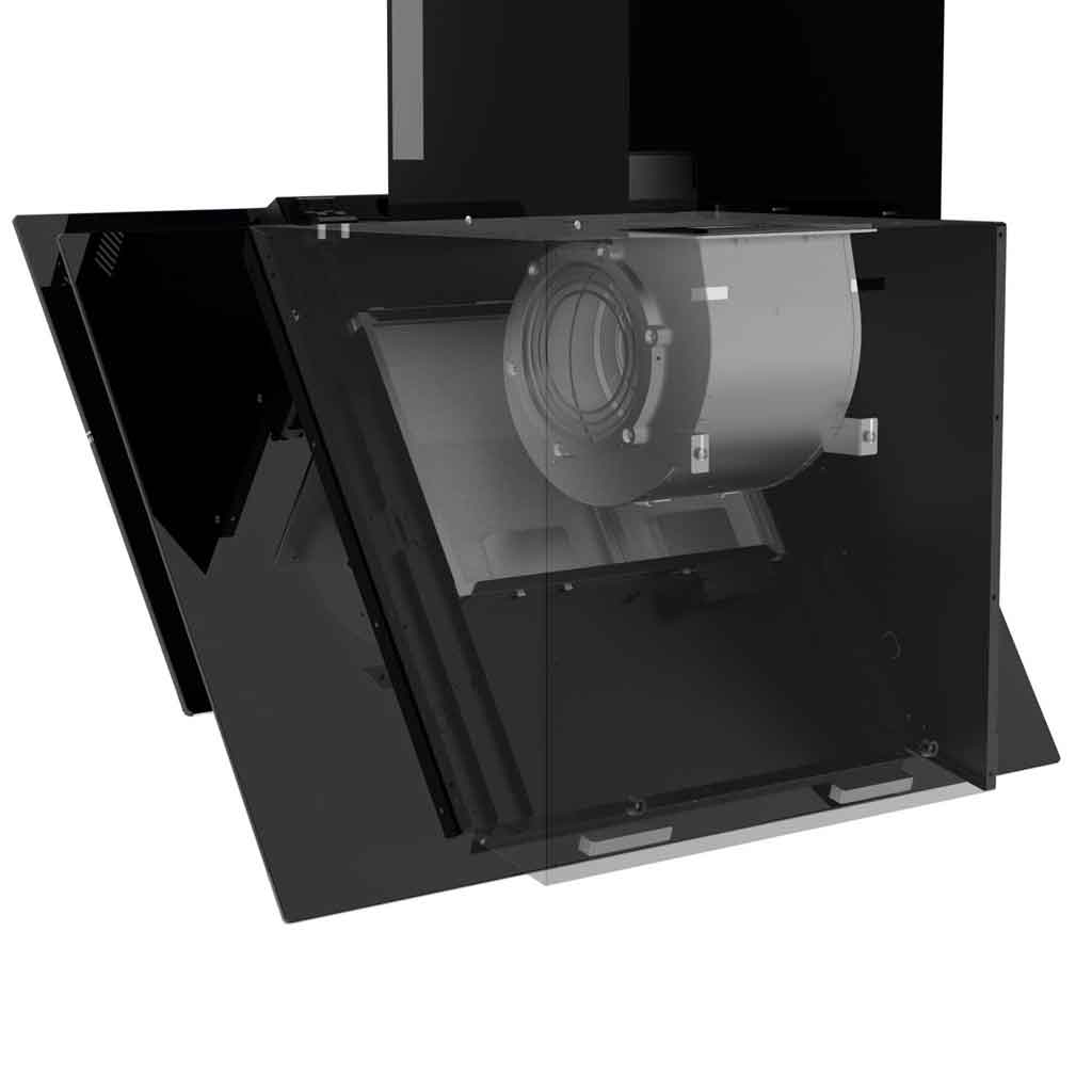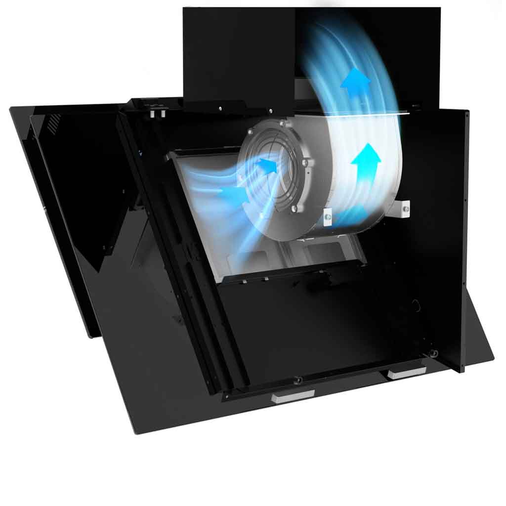 این هود با ابعاد ۹۰ سانتیمتری خود، بهخوبی فضای بالای اجاق گاز را پوشش میدهد. ترکیب شیشه سکوریت مشکی با نوارهای استیل در طراحی بدنه، جلوهای لوکس و مدرن به آشپزخانه شما میبخشد. اما زیبایی، تنها بخشی از داستان است. در پشت این نمای زیبا، یک موتور فلزی توربو با قدرت مکش فوقالعاده ۷۰۰ تا ۹۰۰ متر مکعب بر ساعت قرار گرفته که بهراحتی بوها، دود و ذرات چربی را از فضای آشپزخانه شما خارج میکند.