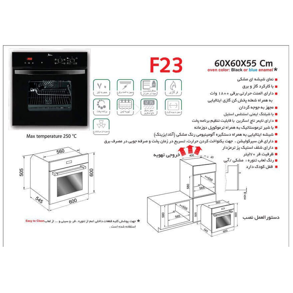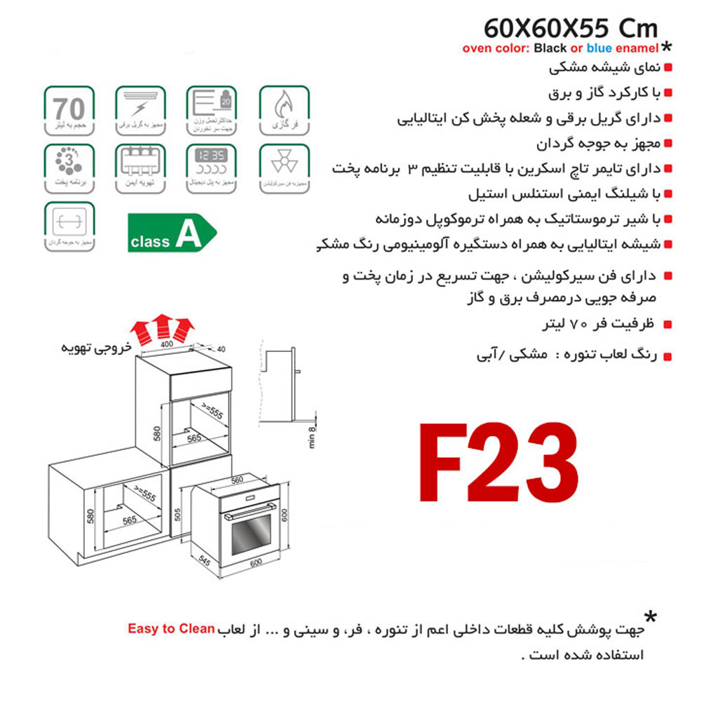 فر اخوان مدل F23 با نمای شیشه مشکی، طراحی ساده و مدرنی دارد که جلوهای شیک به آشپزخانه میبخشد. استفاده از شیشه سکوریت علاوه بر زیبایی، دوام و مقاومت بالایی را تضمین میکند. ترکیب کنترل لمسی و ولومی، کاربری آسان و انعطافپذیری بیشتری برای مصرفکننده فراهم میآورد. ابعاد استاندارد این فر نیز امکان نصب راحت در کابینتهای آشپزخانه را فراهم میکند و هماهنگی خوبی با سایر تجهیزات آشپزخانه دارد.