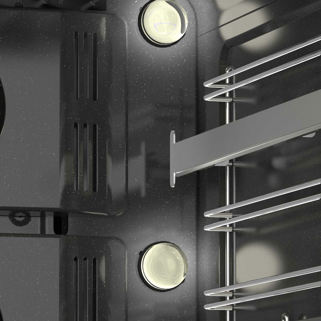 فر آلتون مدل V550TG مجهز به صفحه نمایشگر دیجیتال از نوع LCD نگاتیو است که کار با فر را بسیار ساده و لذتبخش کرده است. چهار عدد ریل تلسکوپی امکان کشیدن آسان و ایمن سینیها را بدون نیاز به فشار فراهم میکنند و از افتادن ناگهانی ظروف داغ جلوگیری مینمایند. لولای آرامبند (Soft Close) نیز درب فر را به نرمی و بدون صدا و ضربه میبندد که برای آشپزخانههای مدرن که آرامش در آنها اهمیت دارد، یک مزیت ارزشمند است. حسگر پخت گوشت (Meat Probe) دمای داخلی غذا را اندازهگیری کرده و از پخت بیش از حد و خشک شدن آن جلوگیری میکند.