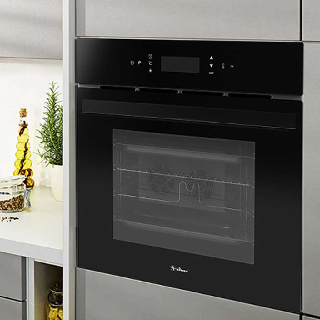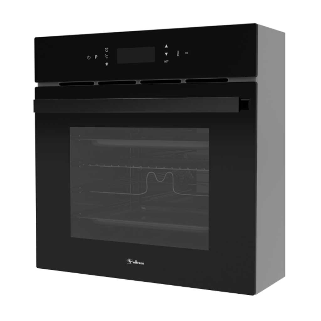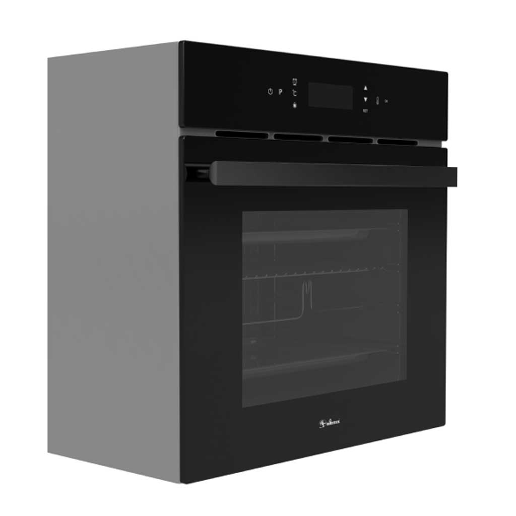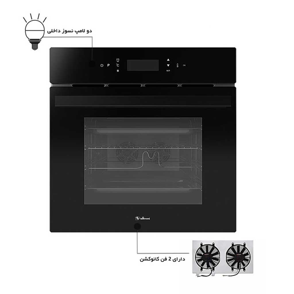 این فر با نمای شیشه سکوریت مشکی و دستگیره آلومینیومی آنودایز شده، جلوهای مدرن و مقاوم دارد. درب دوجداره سکوریت مقاوم به حرارت و سیستم آسان بازشو علاوه بر زیبایی، ایمنی و سهولت استفاده را تضمین میکنند. صفحه کنترل لمسی دیجیتال نیز ظاهر حرفهای و کاربرپسند را تکمیل میکند.