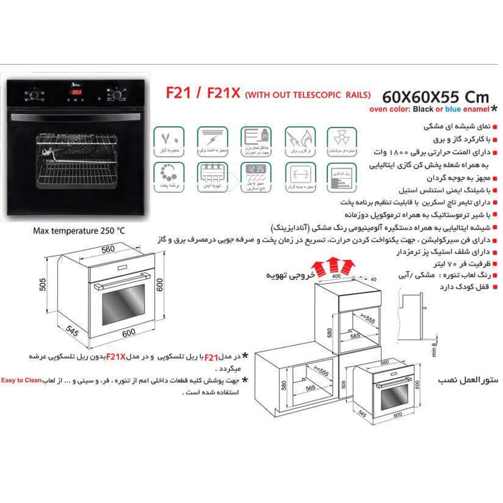 فر اخوان مدل F21 با نمای شیشه مشکی، طراحی ساده و مدرن دارد که جلوهای شیک به آشپزخانه میبخشد. استفاده از شیشه سکوریت علاوه بر زیبایی، دوام و مقاومت بالایی را تضمین میکند. ترکیب کنترل لمسی و ولومی، کاربری آسان و انعطافپذیری بیشتری برای مصرفکننده فراهم میآورد. ابعاد استاندارد این فر نیز امکان نصب راحت در کابینتهای آشپزخانه را فراهم میکند و هماهنگی خوبی با سایر تجهیزات آشپزخانه دارد.