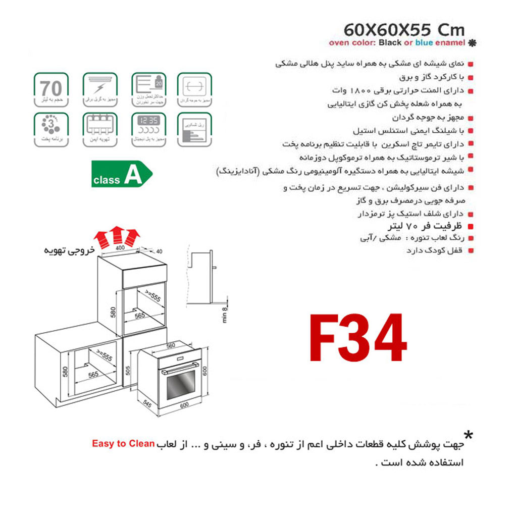 فر اخوان مدل F34 با نمای شیشه مشکی و طراحی ساده، ظاهری کلاسیک و مقاوم دارد. استفاده از شیشه سکوریت علاوه بر زیبایی، دوام و مقاومت بالایی را تضمین میکند. کنترل پنل ولومی مکانیکی، حس سنتی و کاربردی را به دستگاه بخشیده و کاربری آن را برای کسانی که به تنظیمات دستی علاقه دارند آسانتر میسازد. ابعاد استاندارد این فر امکان نصب راحت در کابینتهای آشپزخانه را فراهم میکند و با سایر تجهیزات آشپزخانه هماهنگی خوبی دارد.
