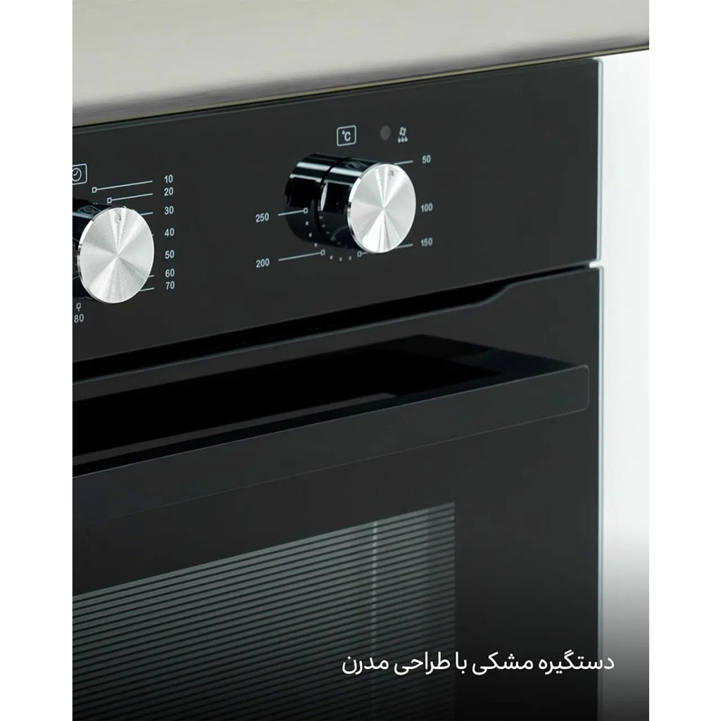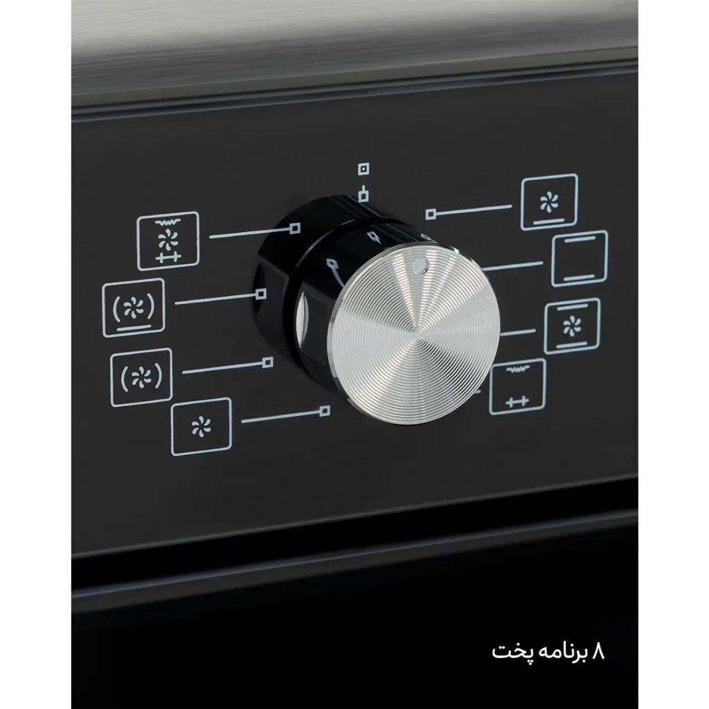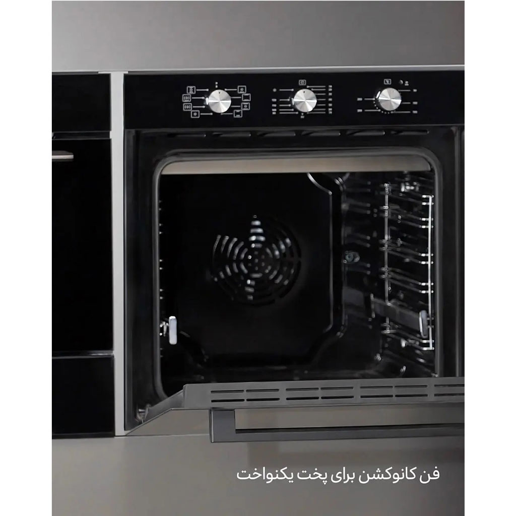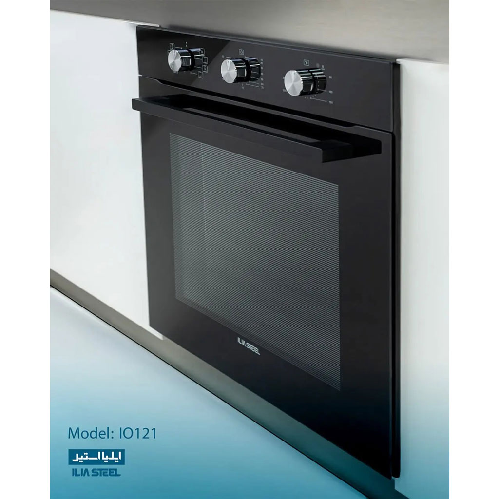 مدل IO-121 با نمای شیشه سکوریت مشکی طراحی شده است که جلوهای مدرن و لوکس به آشپزخانه میدهد. درب 4 جداره علاوه بر ایمنی، مانع از هدر رفتن حرارت میشود و لولای آرامبند باعث میشود درب به نرمی باز و بسته شود. محفظه داخلی لعابی مقاوم در برابر حرارت و چربی علاوه بر دوام بالا، تمیزکاری آسانتری دارد. وجود ریلهای تلسکوپی باعث میشود سینیها به راحتی جابهجا شوند و کاربری دستگاه سادهتر گردد.
