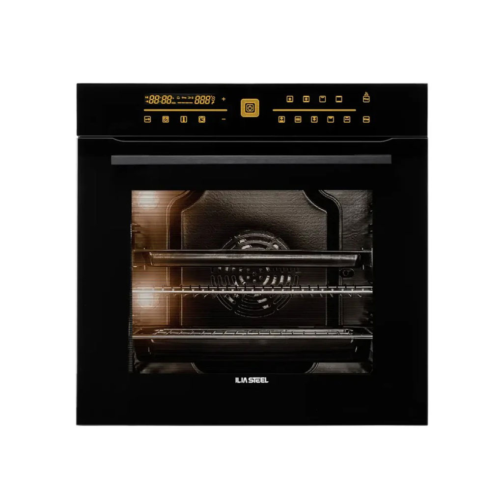 فر ایلیا استیل مدل IO-111 با نمای شیشه سکوریت مشکی و صفحه نمایش دیجیتال طراحی شده است که جلوهای مدرن و لوکس به آشپزخانه میدهد. درب 4 جداره علاوه بر ایمنی، مانع از هدر رفتن حرارت میشود و لولای آرامبند باعث میشود درب به نرمی باز و بسته شود. محفظه داخلی لعابی مقاوم در برابر حرارت و چربی علاوه بر دوام بالا، تمیزکاری آسانتری دارد. وجود ریلهای تلسکوپی باعث میشود سینیها به راحتی جابهجا شوند و کاربری دستگاه سادهتر گردد.