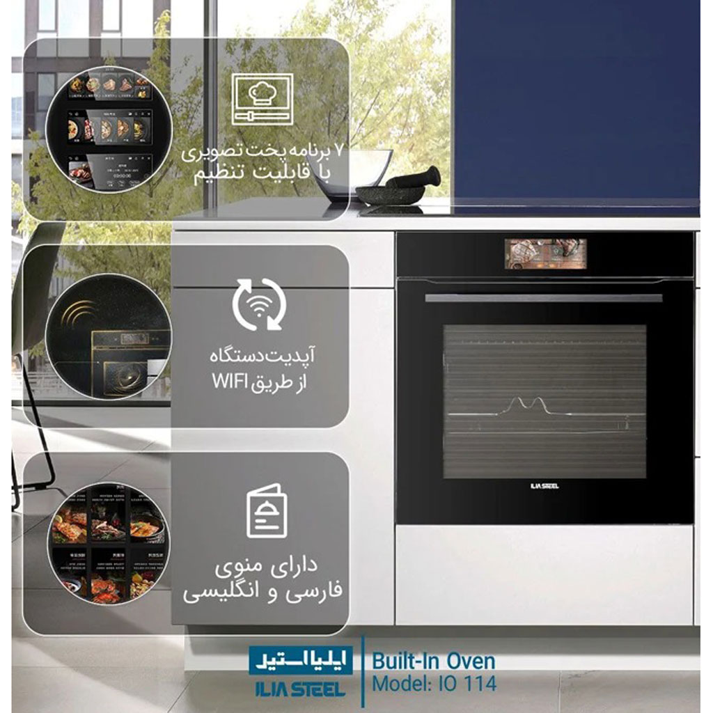 فر ایلیا استیل مدل IO-114 با نمای شیشه سکوریت مشکی و صفحه نمایش دیجیتال طراحی شده است که جلوهای مدرن و لوکس به آشپزخانه میدهد. درب 4 جداره علاوه بر ایمنی، مانع از هدر رفتن حرارت میشود و لولای آرامبند باعث میشود درب به نرمی باز و بسته شود. محفظه داخلی لعابی مقاوم در برابر حرارت و چربی علاوه بر دوام بالا، تمیزکاری آسانتری دارد. وجود ریلهای تلسکوپی باعث میشود سینیها به راحتی جابهجا شوند و کاربری دستگاه سادهتر گردد.