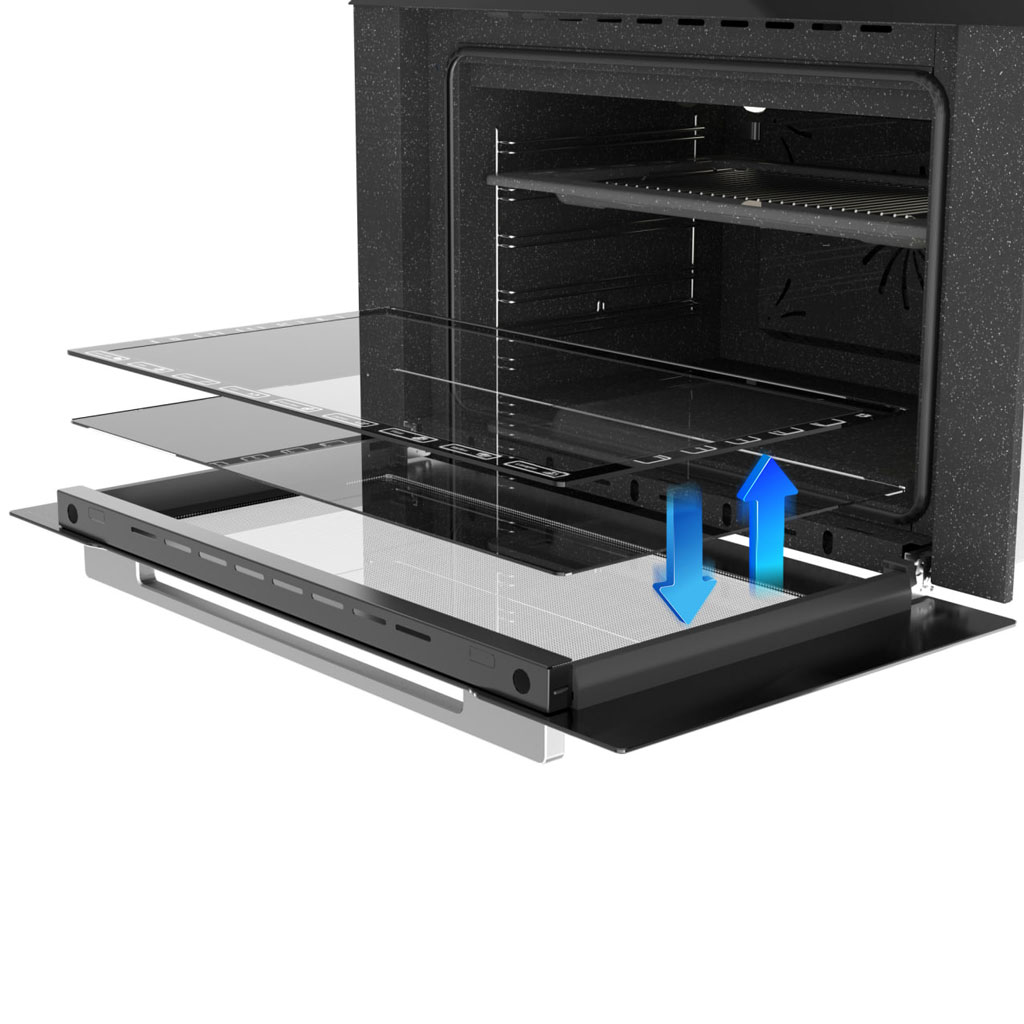فر V901S با نمای مشکی استیل و طراحی مدرن، جلوهای لوکس و حرفهای به آشپزخانه میدهد. درب سه جداره با فناوری Low E علاوه بر ایمنی، مانع انتقال حرارت به بیرون شده و استفاده راحتتر و ایمنتر را فراهم میکند.