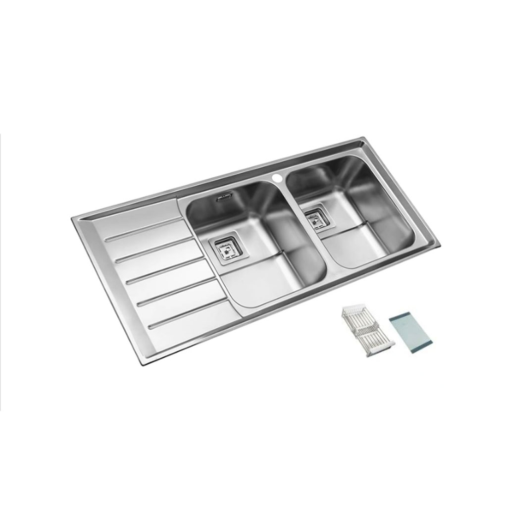 سینک اخوان کد 510 توکار دارای اکسسوری تخت گوشت شیشه ای و سبد ریلی بازشو بوده و از زیر آب مریع که طراحی سینک را بهتر کرده بهره می برد.