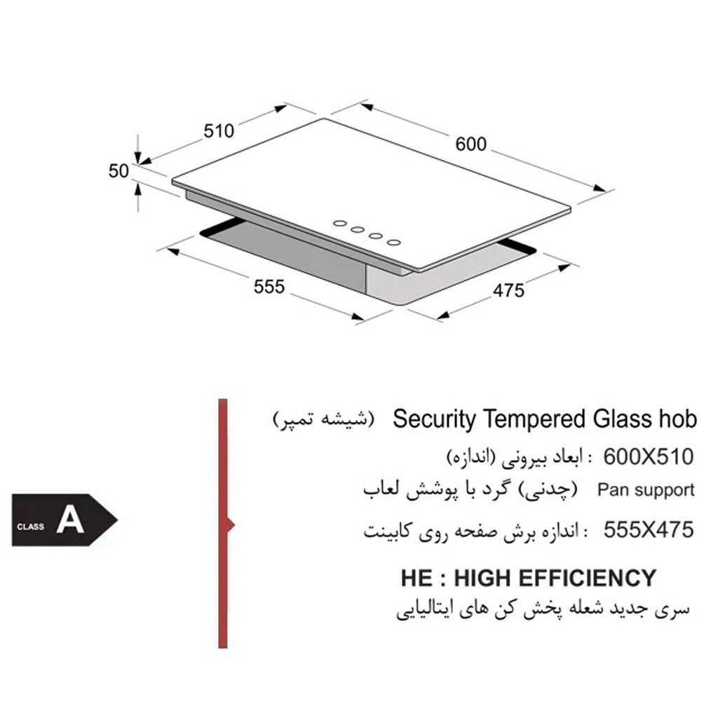 گاز صفحهای اخوان مدل G3 یک نمونه ایدهآل از گازهای چهار شعله فشرده و با راندمان بالا است که برندی معتبر را با تکنولوژی روز ایتالیا ترکیب میکند. این مدل با تمرکز بر مصرف بهینه انرژی و کیفیت ساخت، انتخابی هوشمندانه برای آشپزخانههای مدرن و متوسطانداز محسوب میشود. ویژگی اصلی گاز اخوان مدل G3، طراحی دقیق آن برای نصب حرفهای است. ابعاد فشرده بیرونی آن (۶۰ در ۵۱ سانتیمتر) باعث میشود فضای کمی روی کابینت اشغال کند، در حالی که ابعاد برش کابینت (۵۵.۵ در ۴۷.۵ سانتیمتر) و دستورالعمل نصب (فاصله ۳۵ میلیمتری لبه گاز از لبه کابینت) دقت لازم برای اجرای تمیز و ایمن را مشخص میکند. صفحه آن از جنس شیشه سکوریت (تمپر) مشکی است که علاوه بر ظاهری لوکس و هماهنگ با دکوراسیون مدرن، در برابر حرارت و ضربه مقاوم بوده و نظافت آن بسیار آسان است.