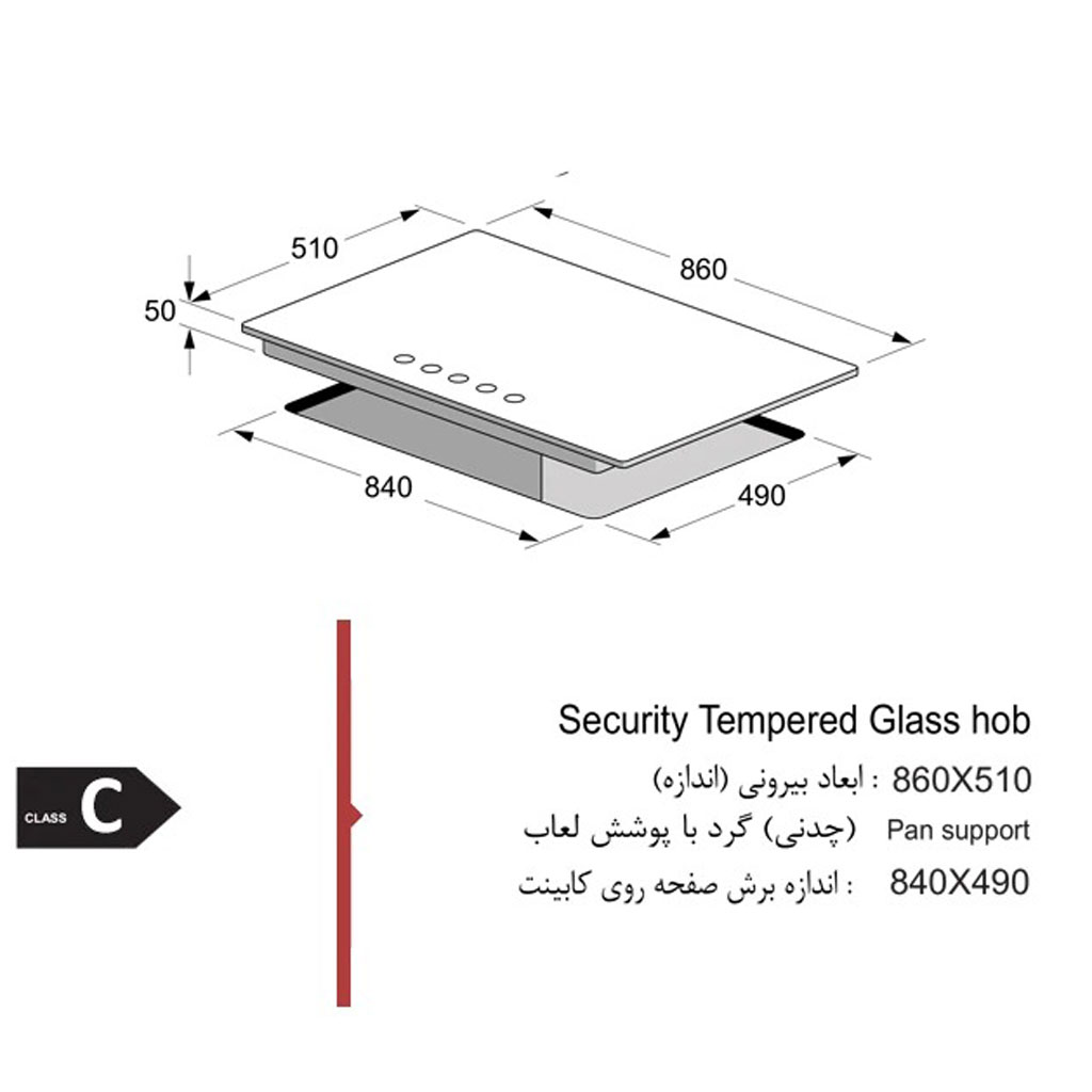 جنس صفحه: شیشه سکوریت مشکی، مقاوم در برابر حرارت و ضربه (ضخامت ۸ میلیمتر) لبه تراش خورده