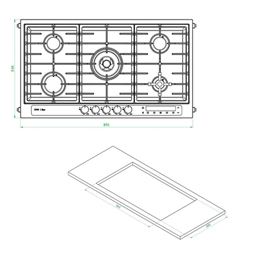 ابعاد برش (برای نصب توکار): ۸۶۵ × ۴۹۰ میلیمتر