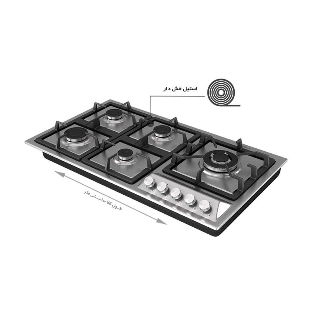 تعداد و آرایش شعله: پنج شعله (۱ عدد شعله پلوپز در سمت راست، ۱ عدد شعله بزرگ، ۲ عدد شعله متوسط، ۱ عدد شعله کوچک)