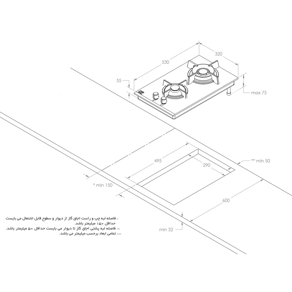سایز اجاق: طول 90 سانتیمتر، عرض 52 سانتیمتر