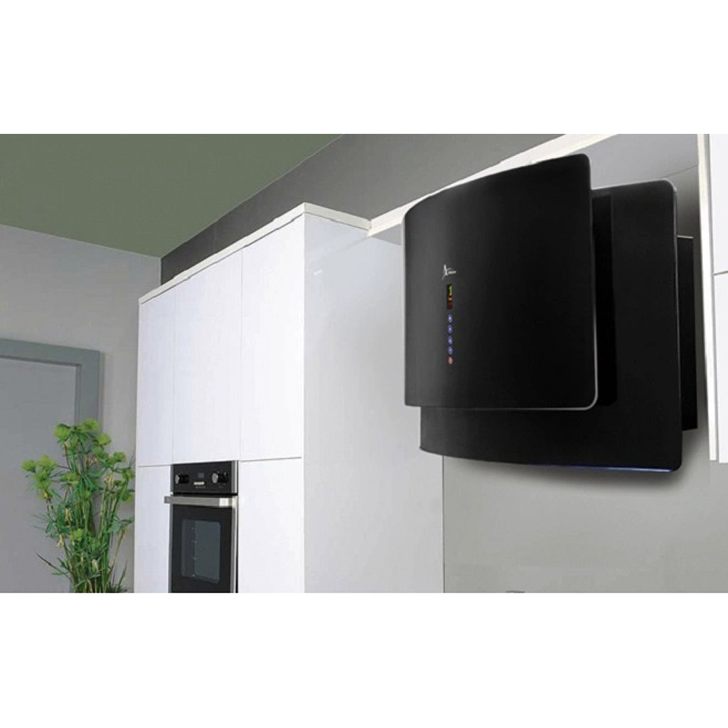 ویژگی بارز این هود، طراحی مورب (زاویهدار) و منحنی آن است. نصب مورب بر روی دیوار، نه تنها ظاهری پویا و مدرن به آشپزخانه میبخشد، بلکه زاویه مناسبتری برای جذب مستقیمتر بخارات و دود از روی اجاق گاز ایجاد میکند. انحنای نرم شیشه مشکی سکوریت، علاوه بر مقاومت در برابر حرارت و شوک، خطوطی سیال و جذاب خلق میکند که به راحتی با یک دستمال مرطوب تمیز میشود. عرض ۶۰ سانتیمتری آن نیز انتخابی ایدهآل برای اجاقگازهای کوچکتر یا فضاهای محدود دیوار است.