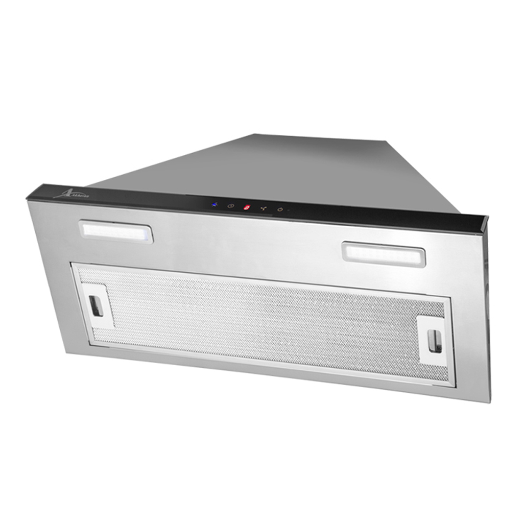 اصلیترین فلسفه وجودی این هود، مفهوم «مخفی بودن» آن است. این محصول به گونهای طراحی شده که پس از نصب، تنها یک نوار باریک و ظریف از آن نمایان میماند. بدنه اصلی دستگاه به طور کامل درون کابینت بالایی اجاق گاز جای میگیرد و این پنل نمایان، ترکیبی از استیل ضدزنگ و شیشه مشکی مقاوم در برابر حرارت است که جلوهای لوکس و امروزی ایجاد میکند. این طراحی کمحجم، نه تنها فضای باارزش بالای سر را اشغال نمیکند، بلکه احساس نظم و وسعت بصری را به آشپزخانه القا مینماید.