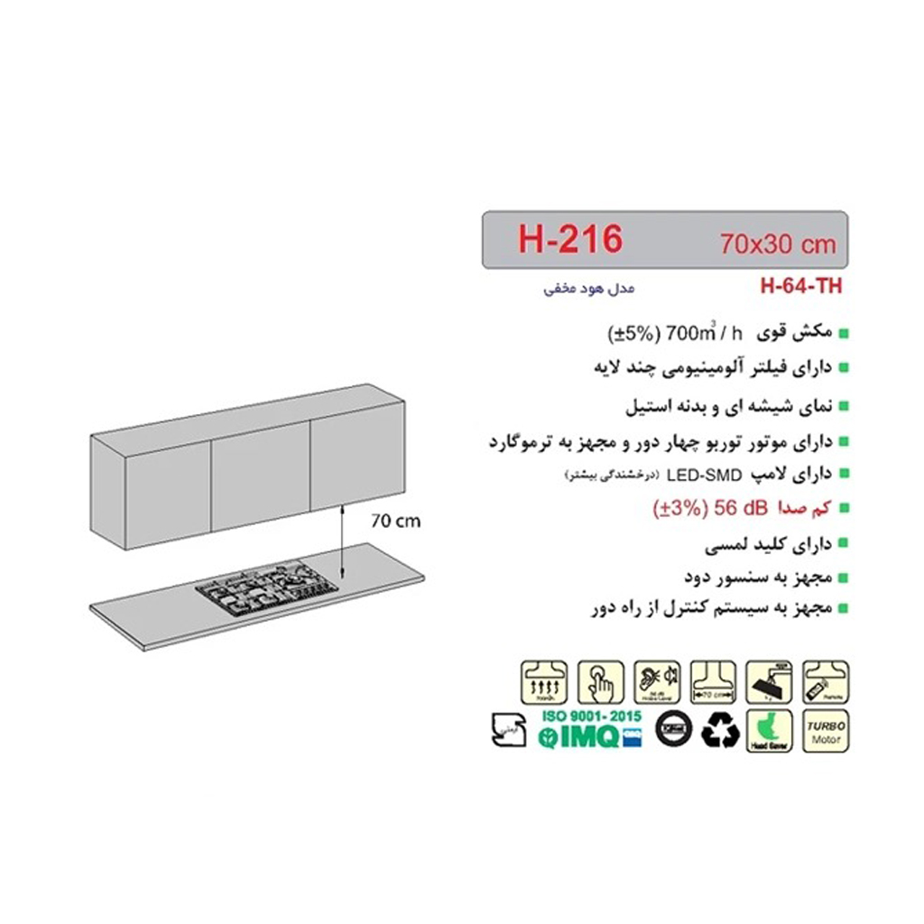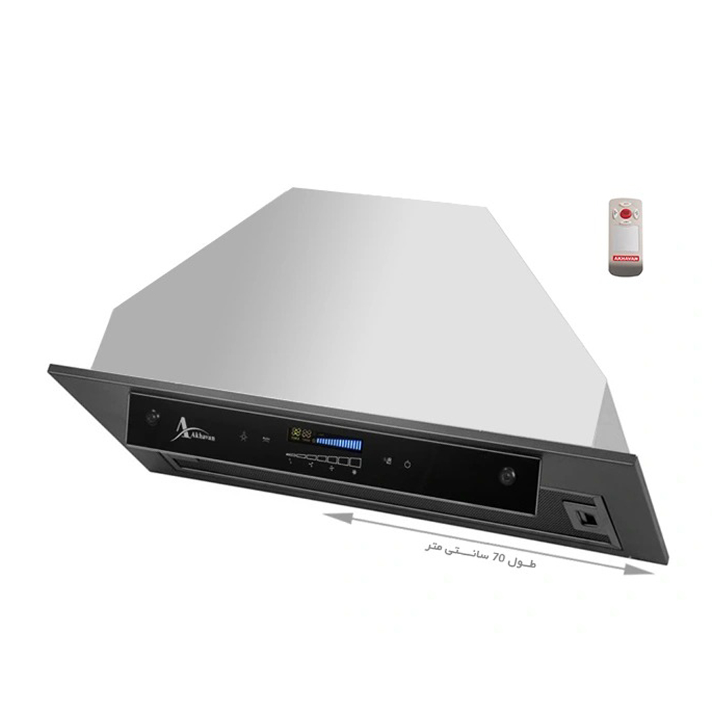 هود مخفی اخوان مدل H-216 با نمای ترکیبی شیشه سکوریت مشکی و بدنه استیل رنگ شده، طراحی منحصر به فردی را ارائه میدهد. ابعاد 70 در 30 سانتیمتری این هود، امکان نصب آسان در انواع کابینتهای استاندارد آشپزخانه را فراهم میکند.