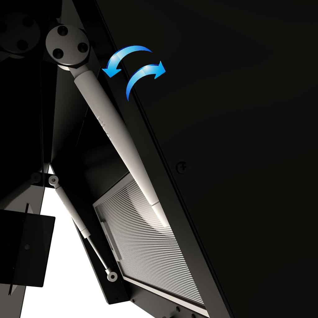 این هود با ابعاد ۹۰ سانتیمتری، به خوبی فضای بالای اجاق گازهای استاندارد را پوشش میدهد. طراحی مورب آن، علاوه بر زیبایی، دسترسی آسانتری را برای شما فراهم میکند. استفاده از تک شیشه سکوریت مشکی نه تنها بر عمق و زیبایی محصول میافزاید، بلکه تضمینکننده مقاومت آن در برابر حرارت و ضربه است. عملکرد نرم و بیصدای جک گازی در باز و بسته کردن هود، بر حس کیفیت و شکوه محصول تأکید میکند.