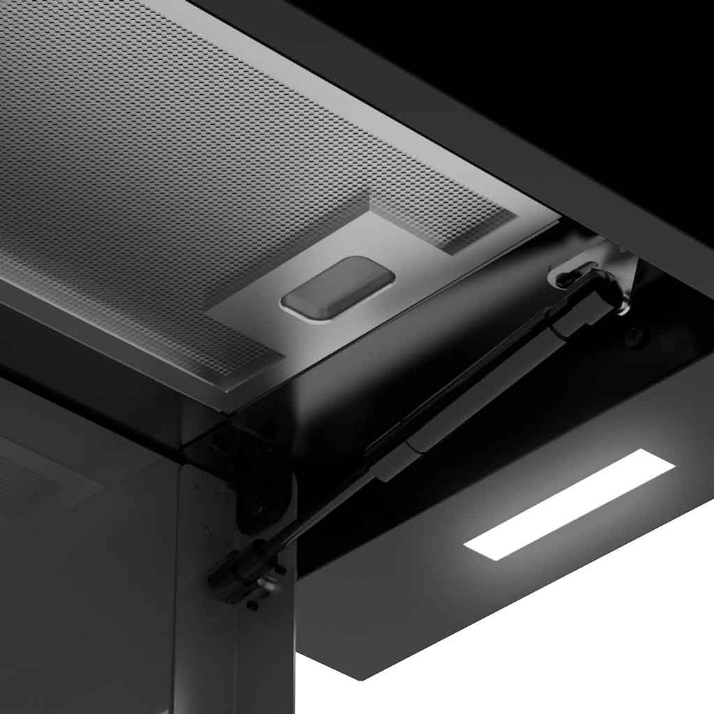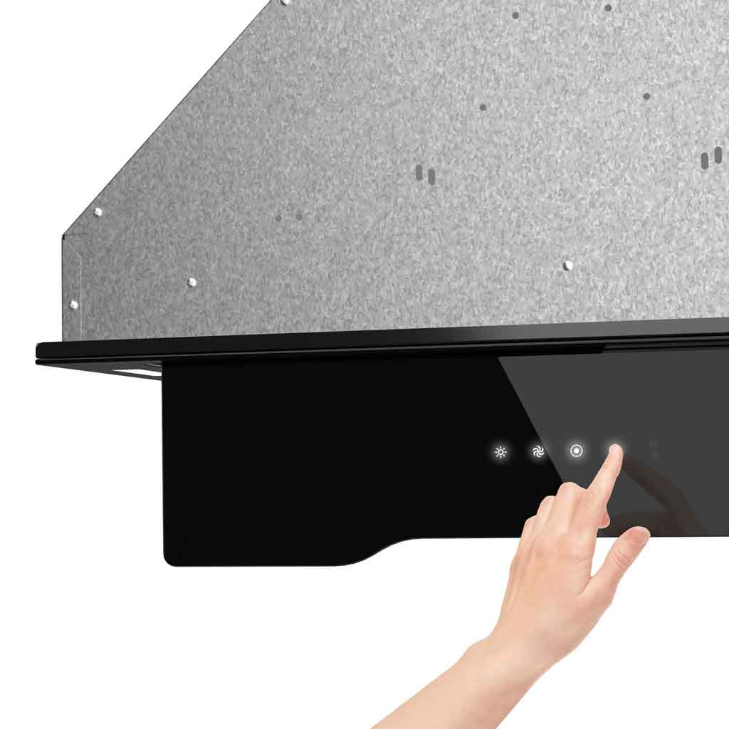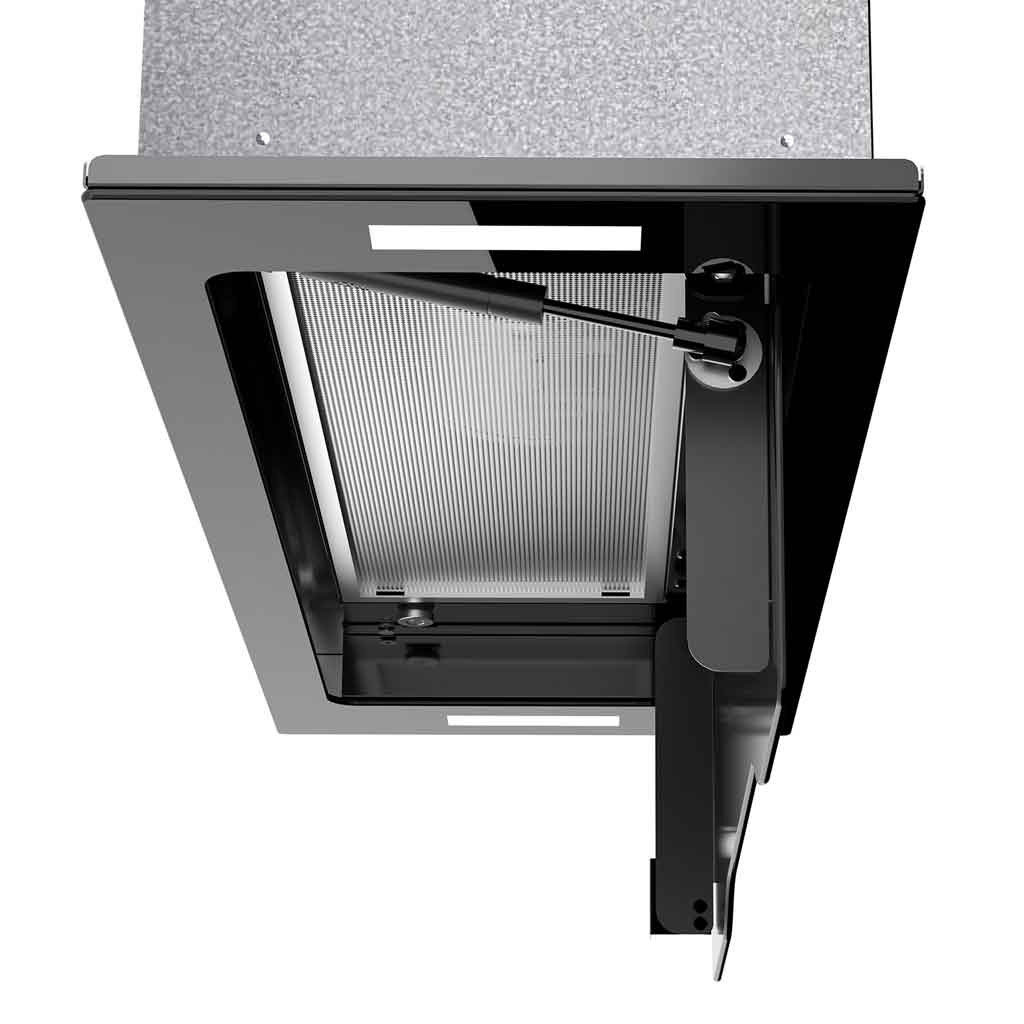 این هود با طراحی مخفی (توکار)، به گونهای ساخته شده که در کابینتها یا دیوار محو میشود و تنها نمای ظاهری آن، پنل شیشه سکوریت مشکی با فریم استیل است که جلوهای لوکس و امروزی به آشپزخانه میبخشد. این شیشه علاوه بر مقاومت در برابر حرارت و ضربه، به راحتی تمیز میشود و نگهداری از آن را آسان میکند.