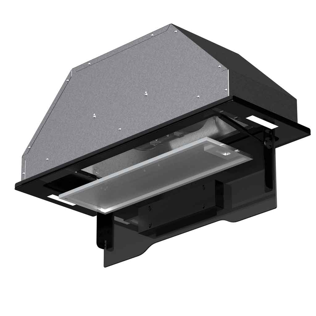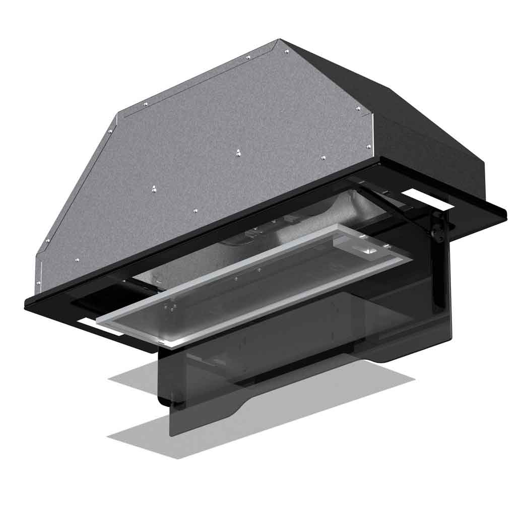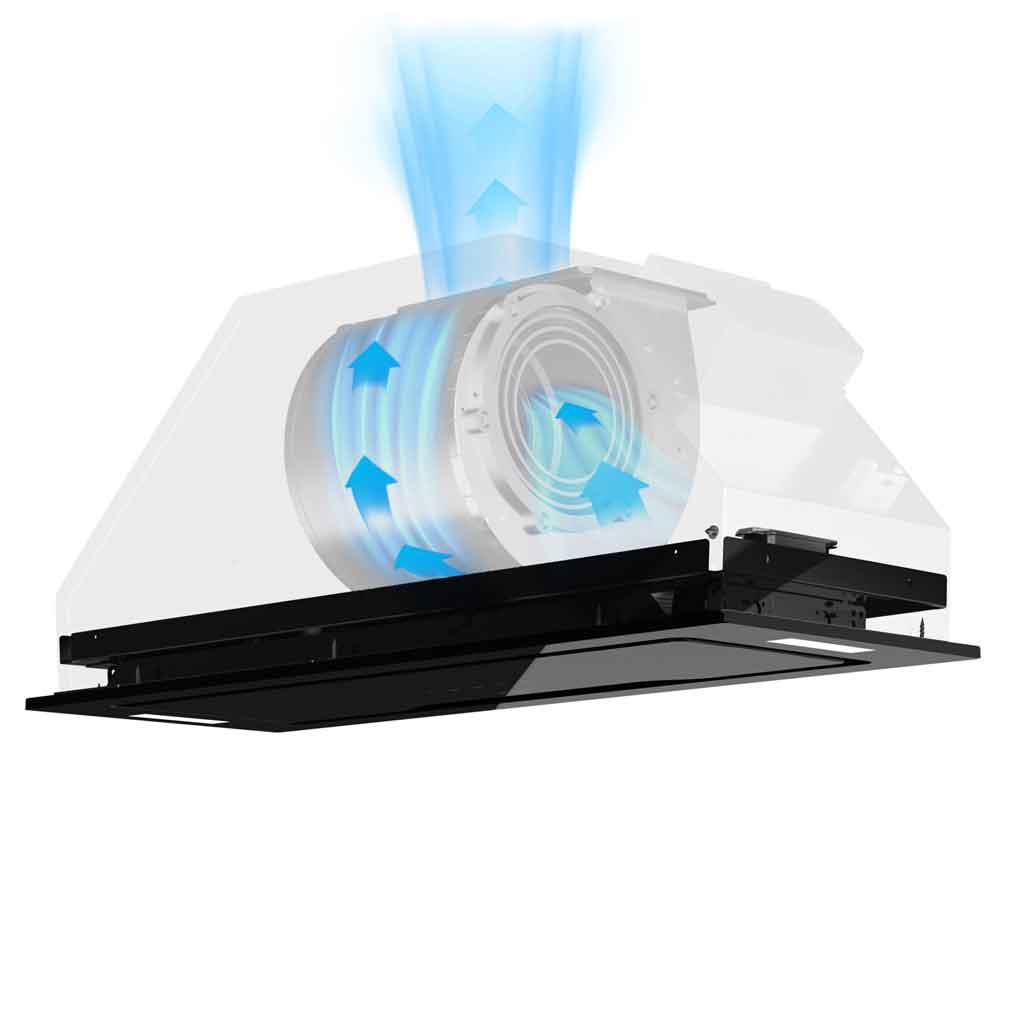 این هود با طراحی مخفی (توکار)، به گونهای ساخته شده که در کابینتها یا دیوار محو میشود و تنها نمای ظاهری آن، پنل شیشه سکوریت مشکی با فریم استیل است که جلوهای لوکس و امروزی به آشپزخانه میبخشد. این شیشه علاوه بر مقاومت در برابر حرارت و ضربه، به راحتی تمیز میشود و نگهداری از آن را آسان میکند.