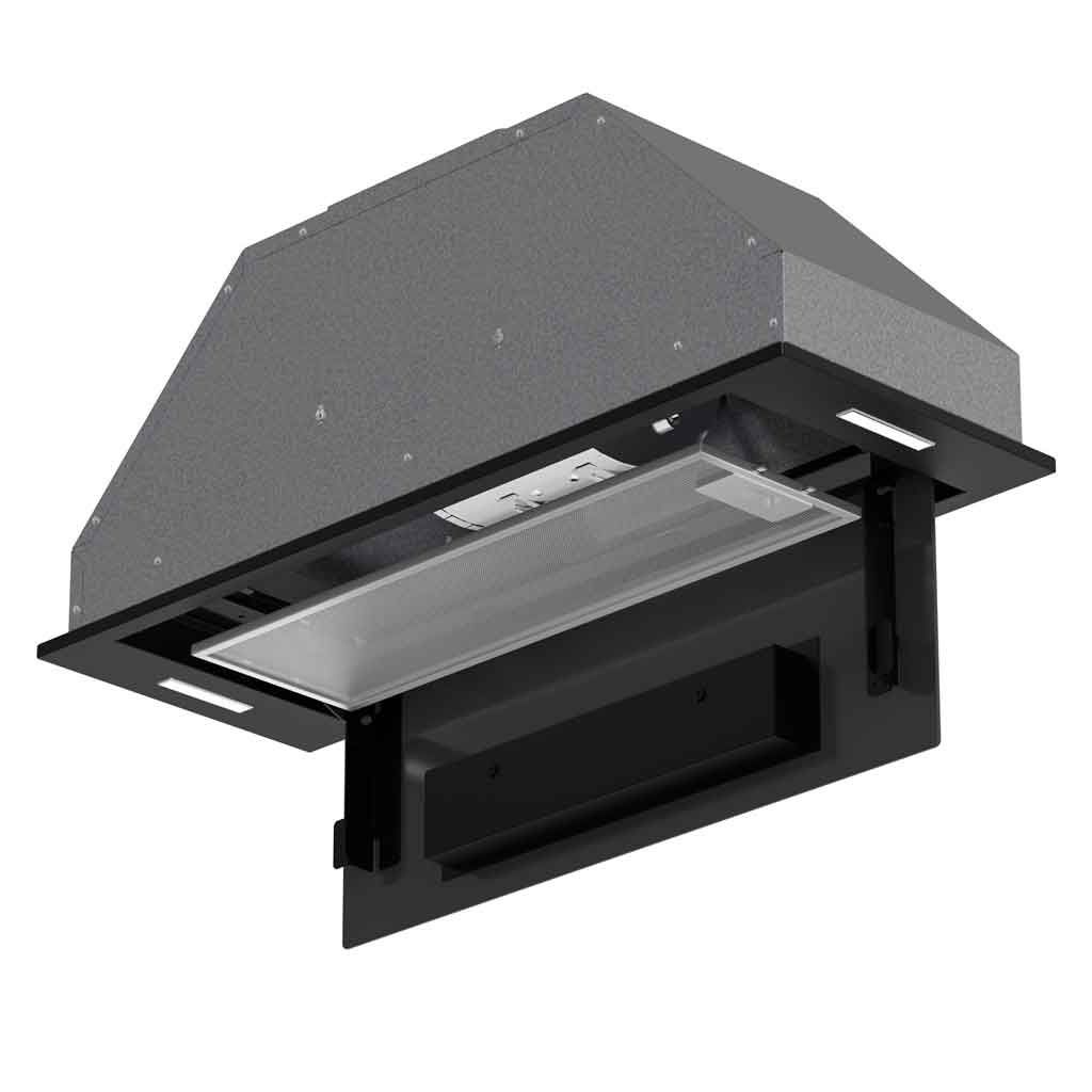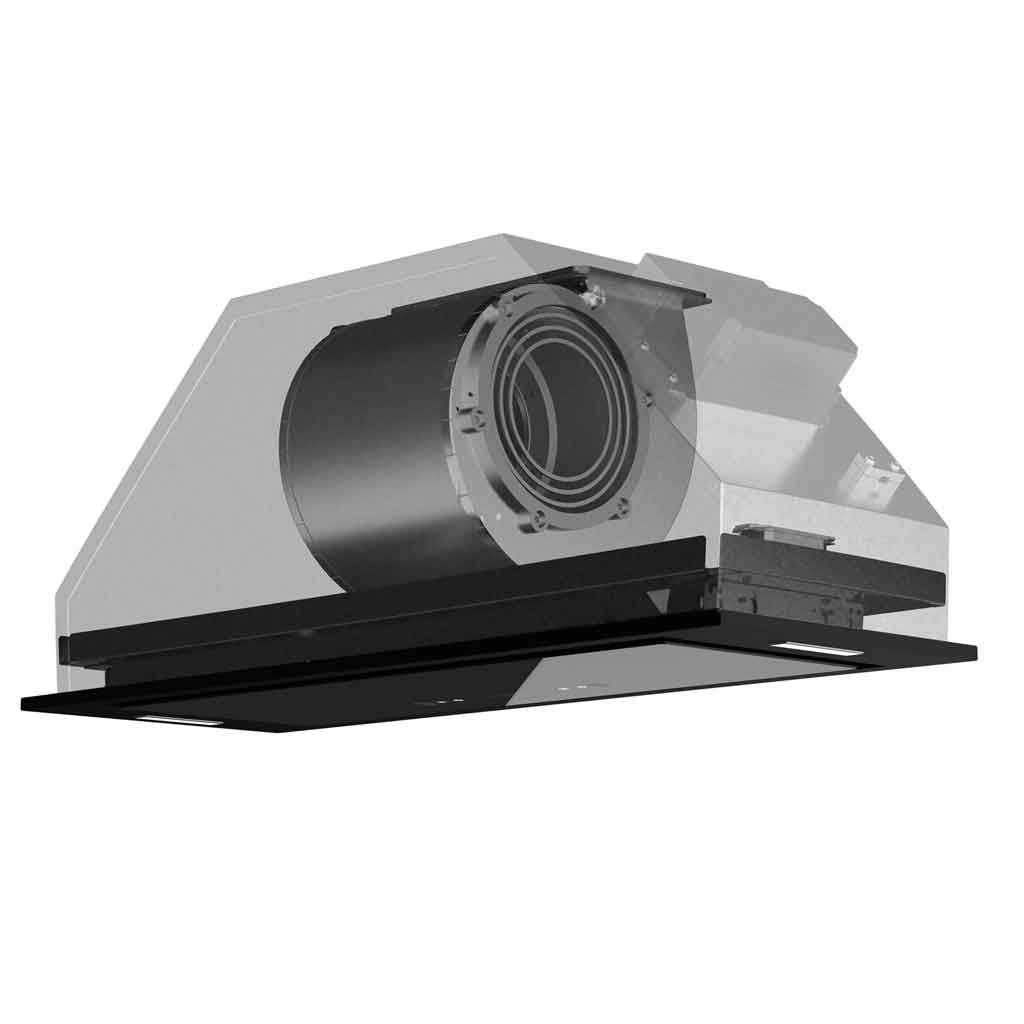 هود H808 با ابعاد ۸۰ سانتیمتری و طراحی مخفی خود، به راحتی در کابینتهای آشپزخانه جای میگیرد و زمانی که بسته است، تنها نمای شیشهای مشکی با فریم فلزی آن جلوهای از ظرافت و کلاس را به نمایش میگذارد. ویژگی برجسته درب جکی، باز و بسته شدنِ نرم و بیصدای درب را تضمین میکند و حس استفاده از یک محصول باکیفیت و لوکس را به کاربر القا میکند.