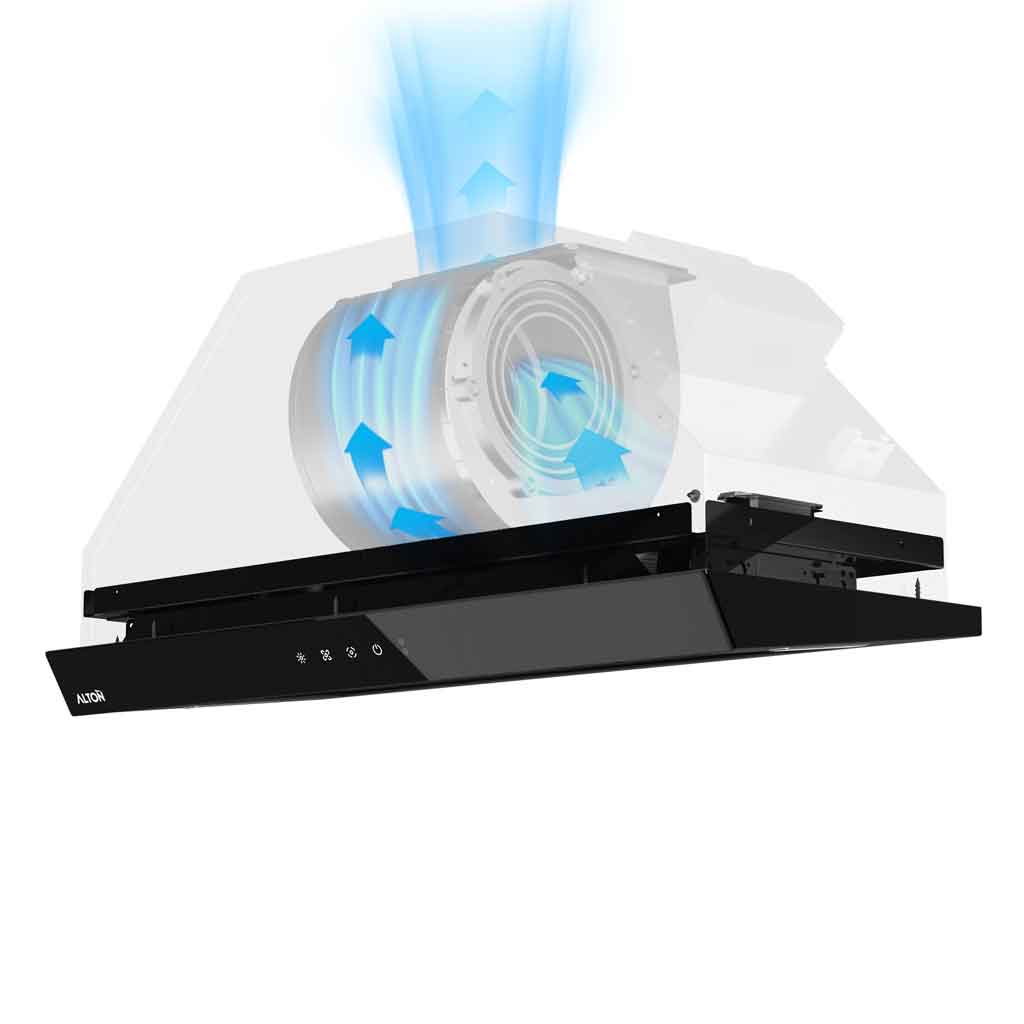 این مدل با بهرهگیری از سنسور فرمان با حرکت دست (موشن)، کنترل هود را به تجربهای مدرن و بهداشتی تبدیل میکند. شما برای تغییر تنظیمات، تنها نیاز به یک حرکت ظریف در مقابل سنسور دارید، بدون آنکه اثری از لمس بر روی سطح بینقص شیشه سکوریت مشکی آن باقی بماند. همچنین، صفحه کلید تمام لمسی امکان کنترل دقیق و آسان تمامی قابلیتها را در اختیار شما قرار میدهد.