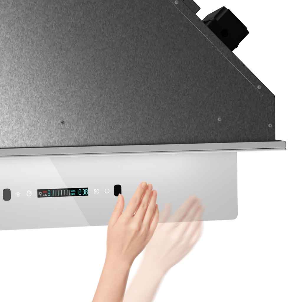 H810W کنترلپذیری را به سطحی جدید ارتقا داده است. سنسور حرکت دست (موشن) به شما این امکان را میدهد تا بدون نیاز به لمس صفحه (که اغلب در حین پختوپز آلوده میشود)، عملکردهای مختلف هود را فرماندهی کنید. این ویژگی، علاوه بر راحتی، یک مزیت بهداشتی کلیدی محسوب میشود. همچنین، جک برقی تعبیهشده برای درب، امکان باز و بسته کردن کاملاً اتوماتیک آن را فراهم میسازد و بر ظرافت و سهولت استفاده میافزاید.