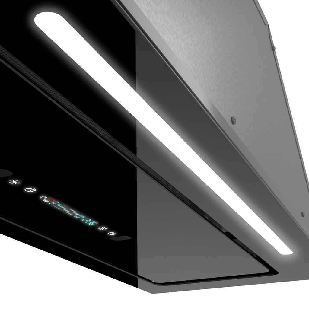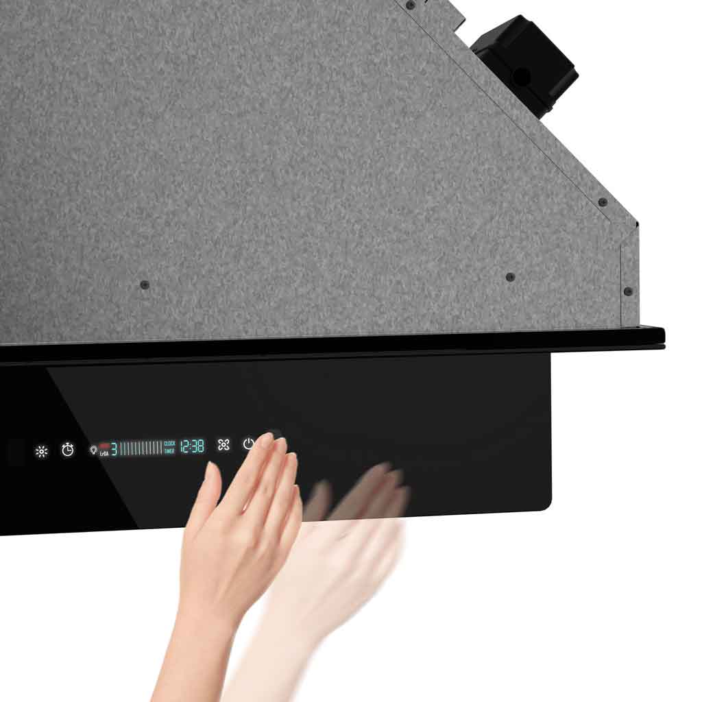 نمای اصلی این هود را شیشه سکوریت مشکی تشکیل میدهد که نه تنها در برابر حرارت و ضربه مقاوم است، بلکه عمقی جذاب به فضا میبخشد. این زیبایی با فریم شیشهای با لبه آینهای تکمیل میشود که با انعکاس نور، درخششی لوکس و مدرن به محصول میدهد. این طراحی هوشمندانه، باعث میشود هود H810B به راحتی با هر نوع دکوراسیون داخلی، از کلاسیک گرفته تا مدرن، هماهنگ شود و به کانون توجه آشپزخانه تبدیل گردد.