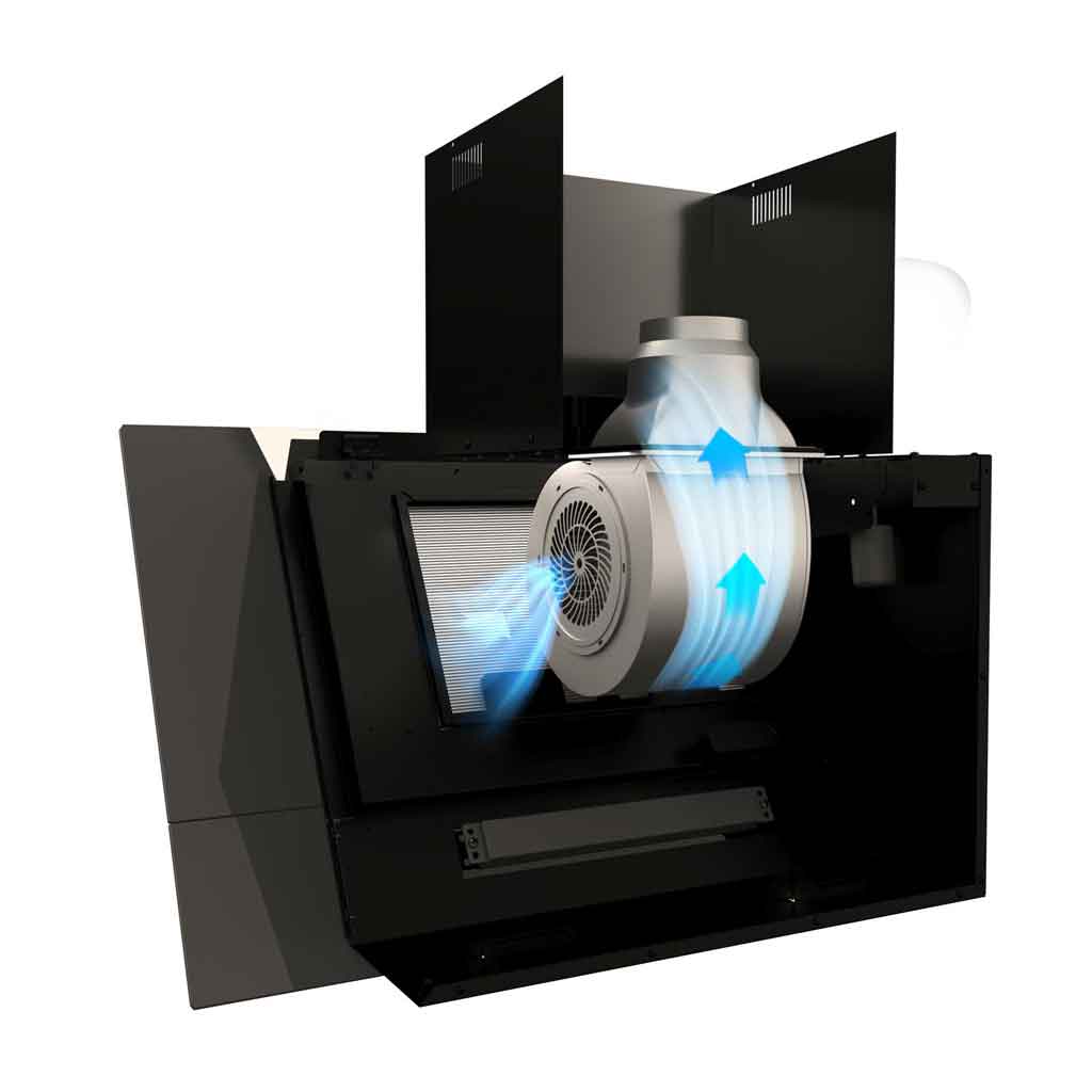 بدنهی تماماً شیشه سکوریت مشکی این هود، جلوهای لوکس و هماهنگ با اکثر سبکهای آشپزخانه، به ویژه طرحهای مدرن و صنعتی ایجاد میکند. ابعاد ۹۰ سانتیمتری آن پوشش کاملی بر روی اجاق گازهای استاندارد ارائه میدهد. در زیر این ظاهر آرام و زیبا، موتور فلزی توربو ۵ دور با قدرت مکش ۷۰۰ تا ۹۰۰ متر مکعب بر ساعت قرار دارد که با قدرتی کمنظیر، هر گونه دود، بوی نامطبوع و رطوبت اضافی را به سرعت از محیط پاک میکند.