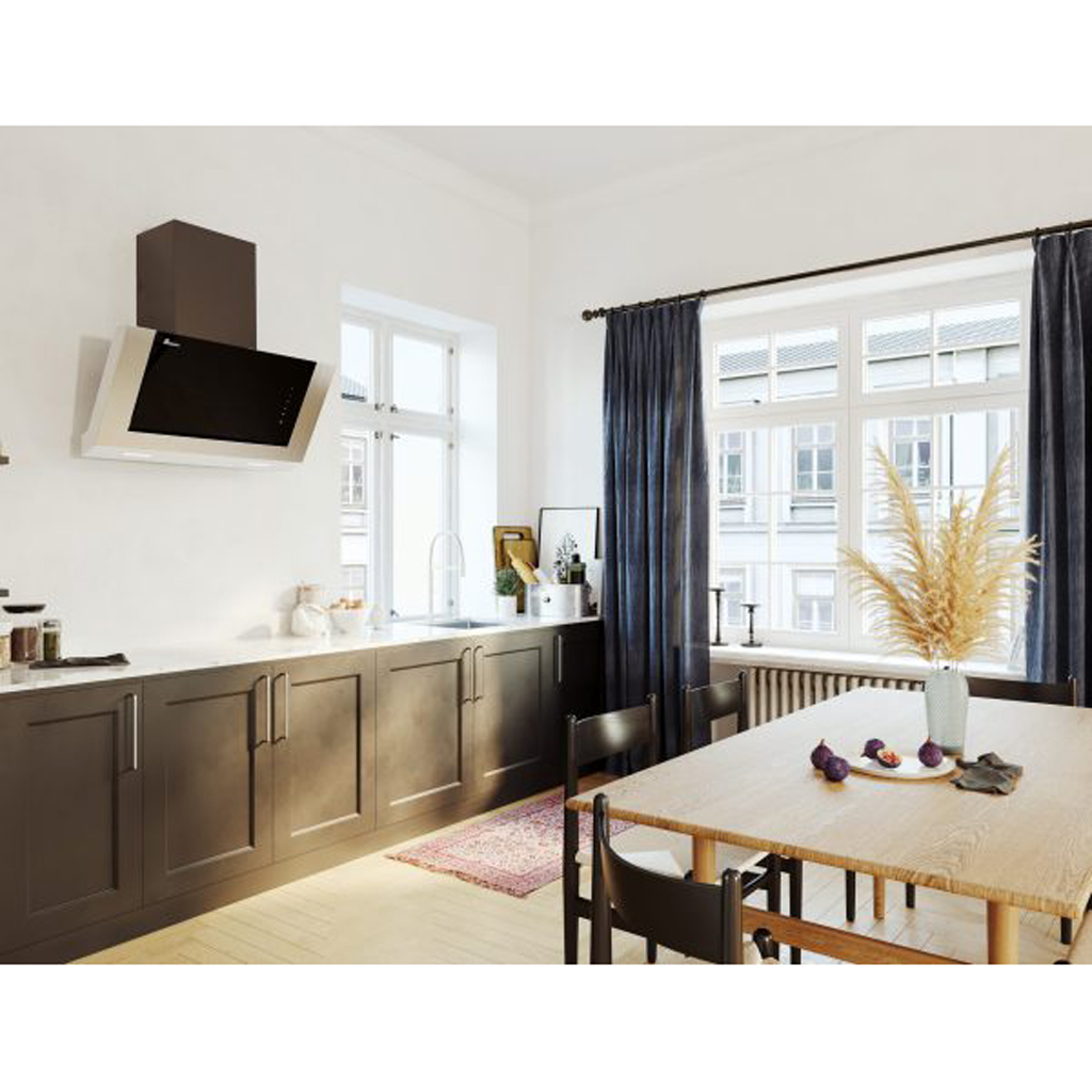 هودهای مورب، بر خلاف مدلهای شومینهای سنتی، با زاویهای حدود ۴۵ درجه بر روی دیوار نصب میشوند . این طراحی نه تنها ظاهر مدرن و کمحجمی به آشپزخانه میبخشد، بلکه با استفاده از جکهای گازی، باز و بسته شدن درب هود را بسیار راحت میکند . این ویژگی دسترسی آسان برای تمیز کردن و همچنین تجربه کاربری بهتری فراهم میآورد. نمای ساخته شده از شیشه سکوریت و استیل آن نیز علاوه بر دوام بالا، به راحتی تمیز میشود و در طول زمان جلوه خود را حفظ میکند .