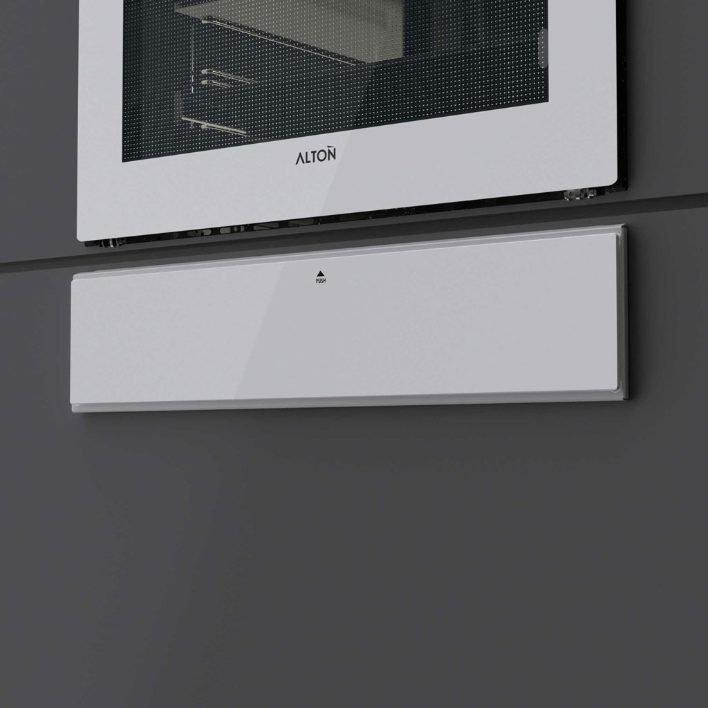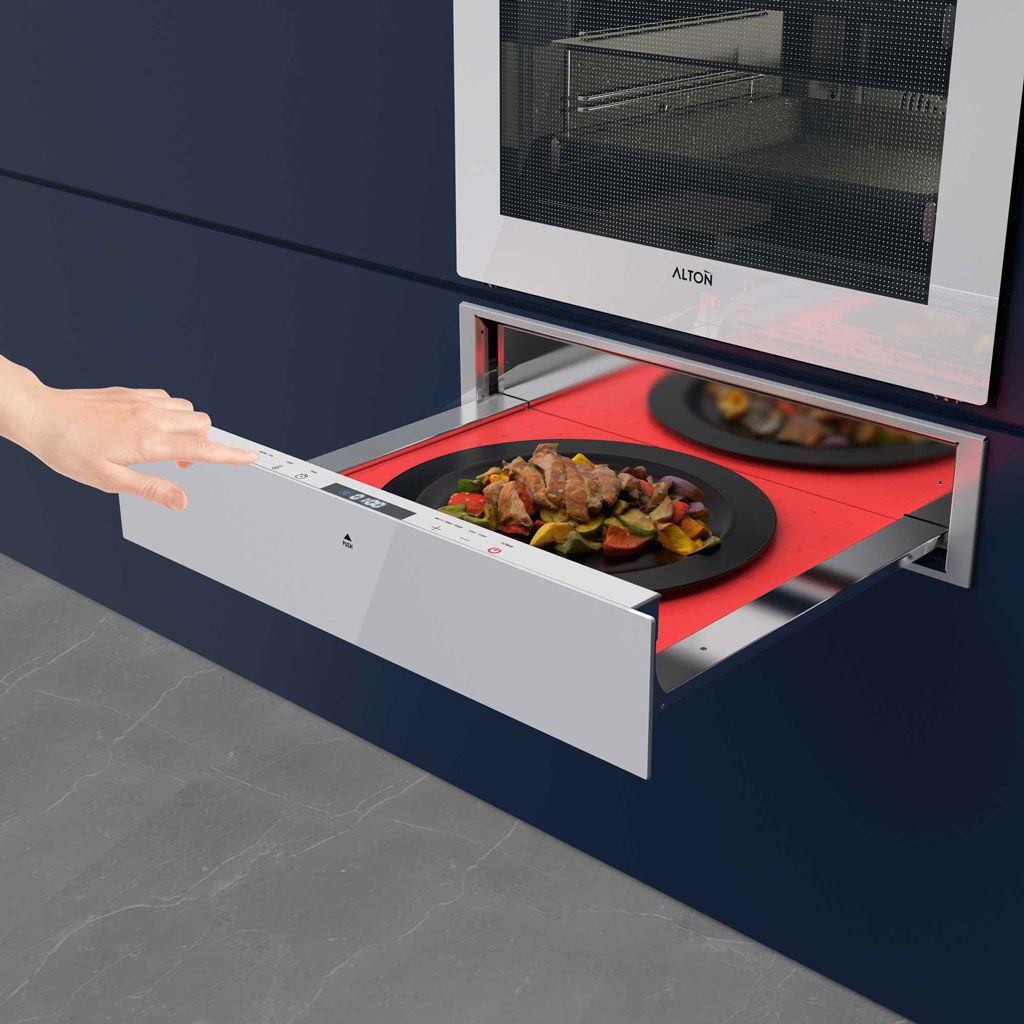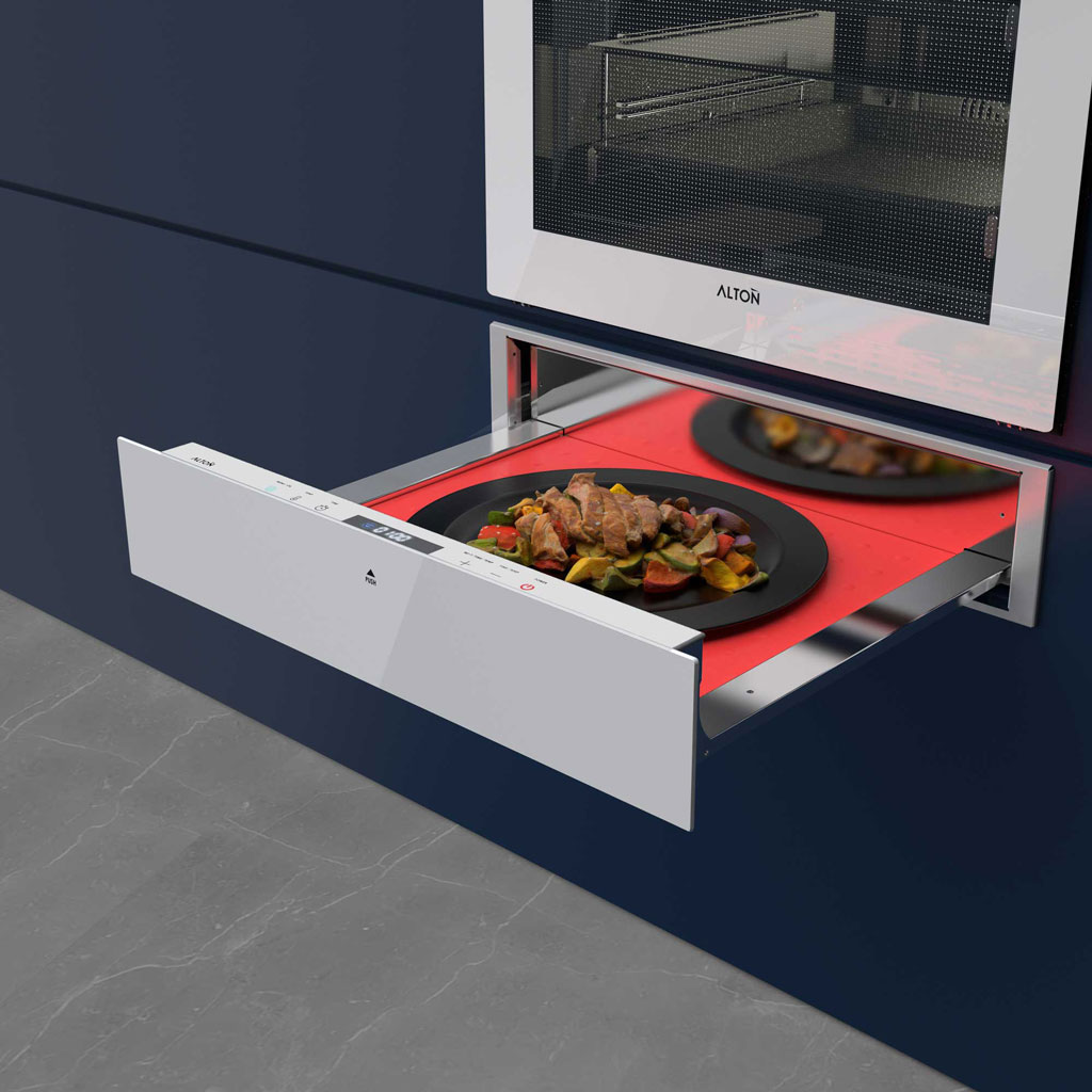 کشو گرمکن آلتون D500W با نمای شیشه سکوریت سفید طراحی شده و ظاهری مدرن و هماهنگ با سایر لوازم توکار آشپزخانه دارد. صفحه کنترل لمسی جلوهای مینیمال و کاربری آسان ایجاد کرده است.