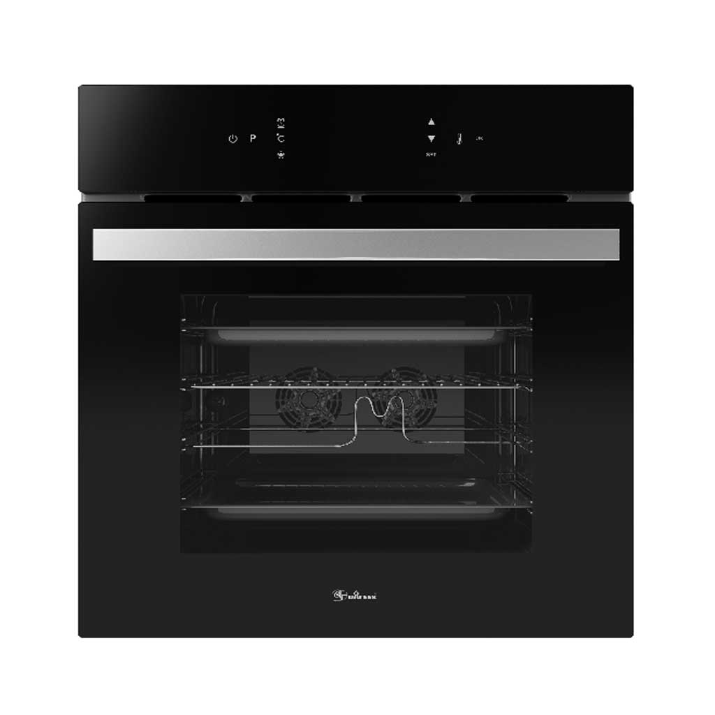 این فر با نمای شیشه سکوریت مشکی و دستگیره آلومینیومی آنودایز شده، جلوهای مدرن و مقاوم دارد. درب دوجداره سکوریت مقاوم به حرارت و سیستم آسان بازشو علاوه بر زیبایی، ایمنی و سهولت استفاده را تضمین میکنند. صفحه کنترل لمسی دیجیتال نیز ظاهر حرفهای و کاربرپسند را تکمیل میکند.