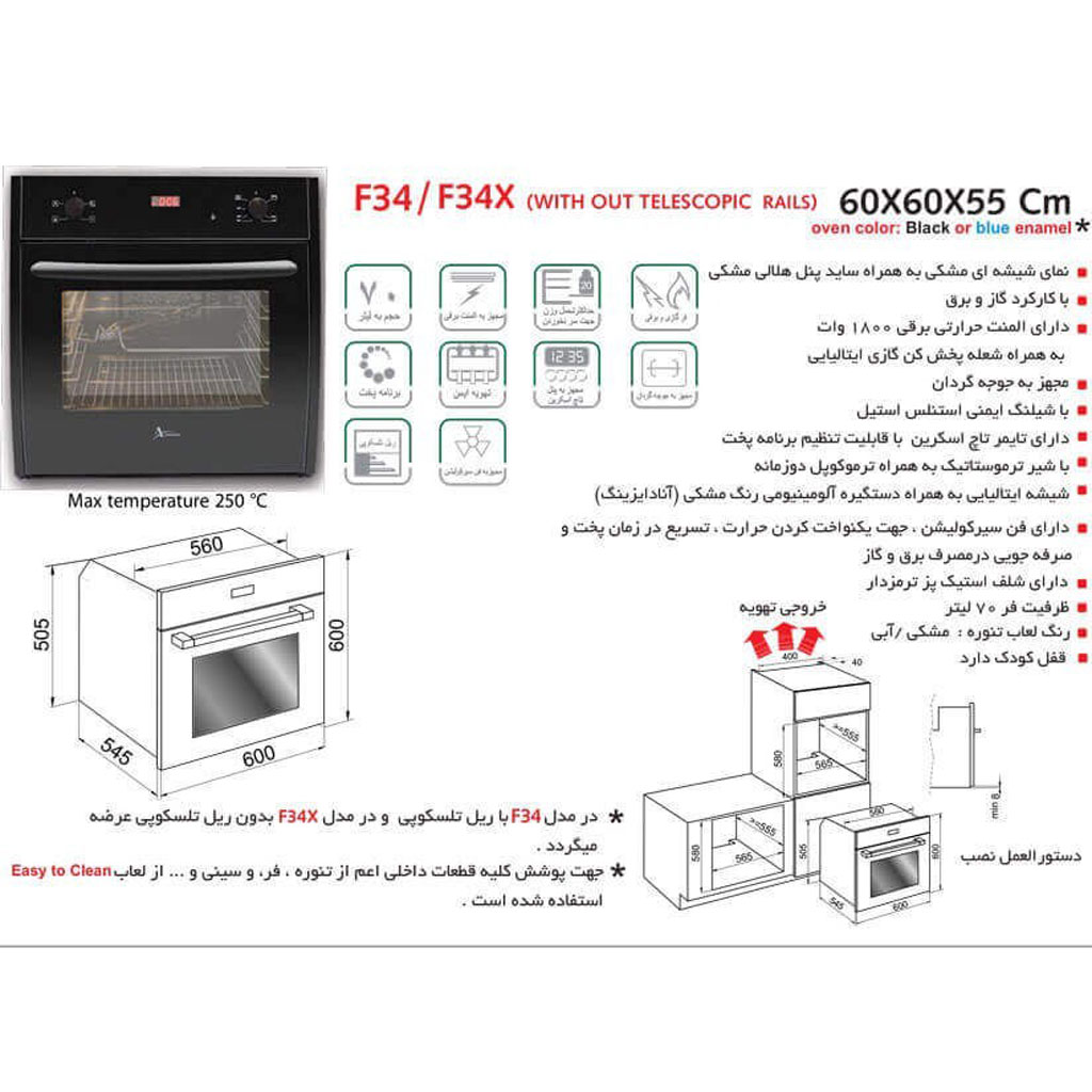 فر اخوان مدل F34 با نمای شیشه مشکی و طراحی ساده، ظاهری کلاسیک و مقاوم دارد. استفاده از شیشه سکوریت علاوه بر زیبایی، دوام و مقاومت بالایی را تضمین میکند. کنترل پنل ولومی مکانیکی، حس سنتی و کاربردی را به دستگاه بخشیده و کاربری آن را برای کسانی که به تنظیمات دستی علاقه دارند آسانتر میسازد. ابعاد استاندارد این فر امکان نصب راحت در کابینتهای آشپزخانه را فراهم میکند و با سایر تجهیزات آشپزخانه هماهنگی خوبی دارد.