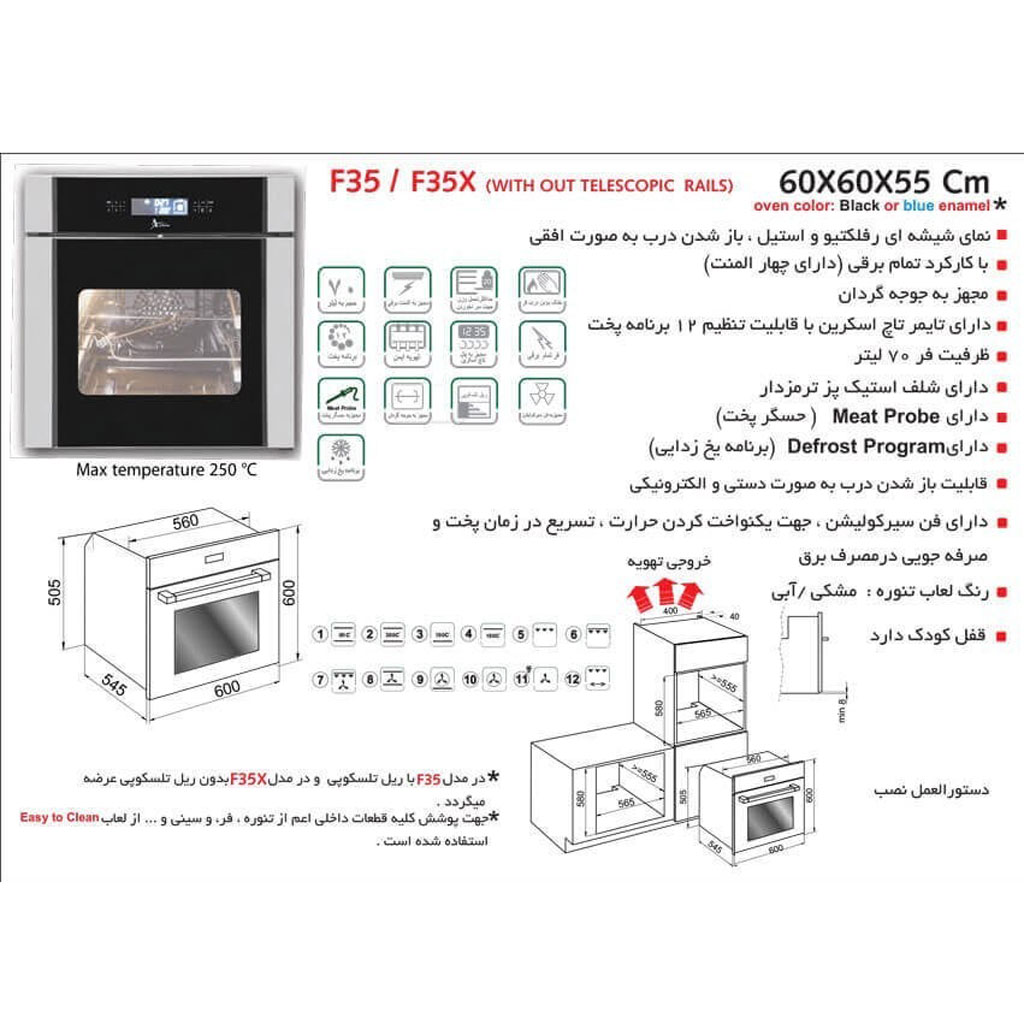 فر برقی توکار اخوان مدل F35 با طراحی استیل و شیشه مشکی، کنترل لمسی، 12 برنامه پخت و امکاناتی مانند فن داکتی، حسگر پخت و ترموکوپل دو زمانه، گزینهای مناسب برای خانوادههایی است که به دنبال دستگاهی مدرن، ایمن و کاربردی هستند. این مدل با ترکیب طراحی لوکس و عملکرد قابل اعتماد، انتخابی عالی برای آشپزخانههای امروزی محسوب میشود.