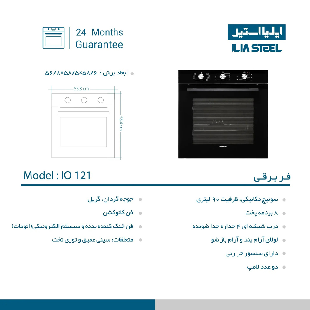 فر توکار ایلیااستیل مدل IO 121 یک فر برقی 90 لیتری با پنل مکانیکی، 8 برنامه پخت، درب شیشهای 4 جداره، امکانات کامل و ایمنی بالا است که برای آشپزخانههای امروزی انتخاب مناسبی محسوب میشود.